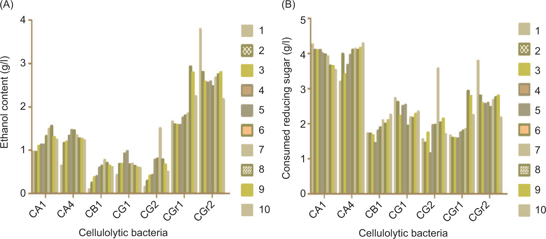 Figure 4. Ethanol (A) and consumed reducing sugar (B) contents in fermentation medium by cellulolytic bacteria within 10 days.