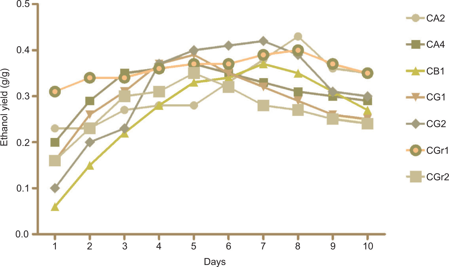 Seven cellulolytic bacteria were allowed to ferment cellulose for about 10 days. Ethanol produced during these days is shown in Figure 4. Ethanol titer showed the maximum production in different days by different isolates. CG2 and CA2 produced maximum ethanol; 2.2±0.138 and 2.12±0.142 g/L on days 7 and 8, respectively. Maximum ethanol in all other strains was seen between day 5 and 8 except CGr1. The highest ethanol on days 7 and 8 by CG2 and CA2, respectively, demonstrated the ethanol tolerance of these strains. So, CA2 and CG2 were termed as potential ethanol producing and tolerating strains.