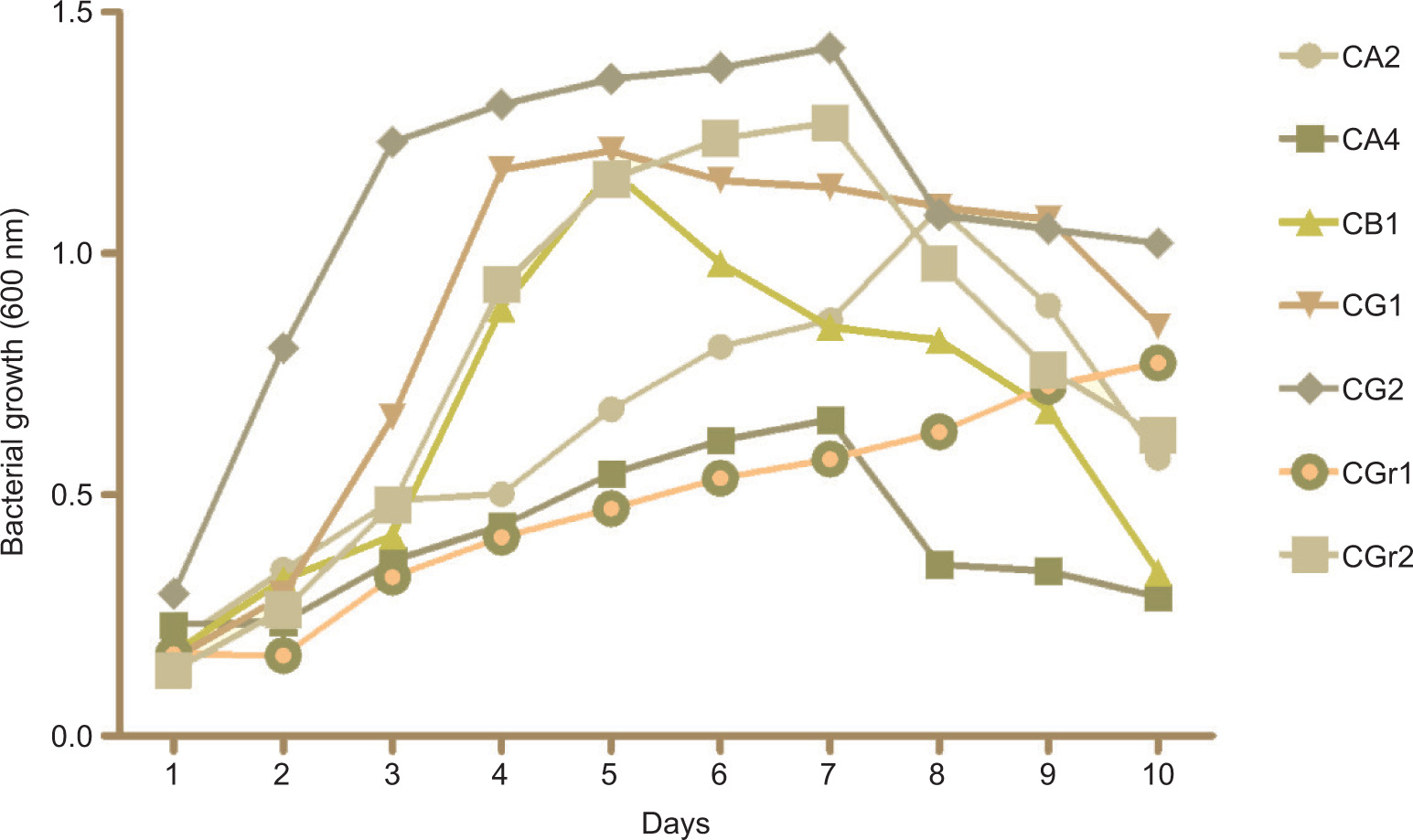 Growth tendencies of all bacteria were evaluated daily at 600 nm wavelength by spectrophotometer (Figure 6). CA2 showed lag phase (day 1–4), log phase (day 5–8) and decline phase (day 9 and 10). CB1, CG1 and CGr2 exhibited lag phase (day 1–3), exponential phase (4–6) and decline phase (7–10).
