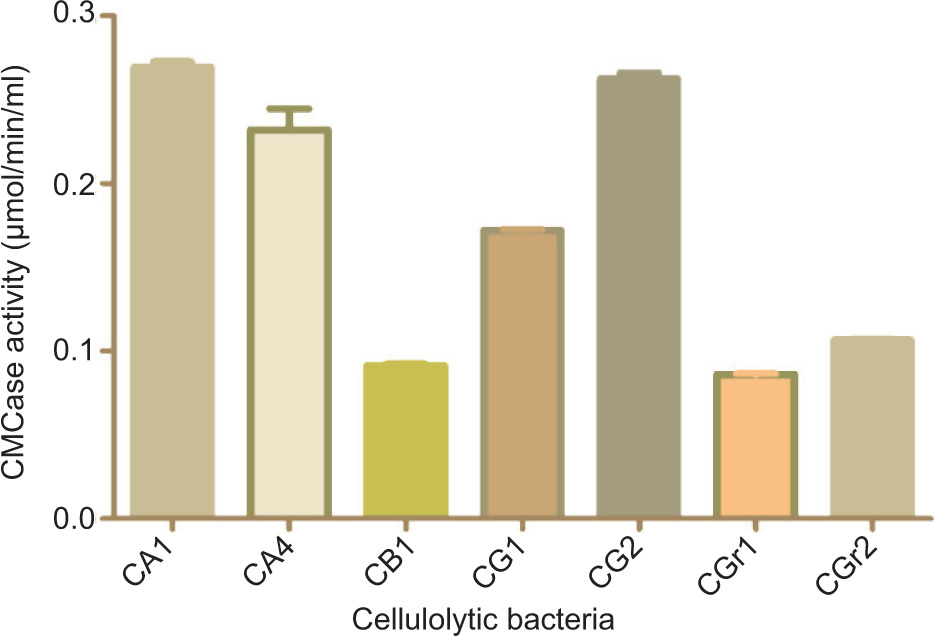 Figure 7 and Table 6 show that all cellulolytic bacteria released enzymes that would be responsible for the degradation of cellulose. CB1 and CGr1 showed enzyme activity but not up to the mark. CG1, CGr1 and CGr2 showed good enzyme activity. CA2 and CG2 showed maximum enzyme activity, i.e., 0.265±0.05, 0.27±0.011 (umol/min/mL).