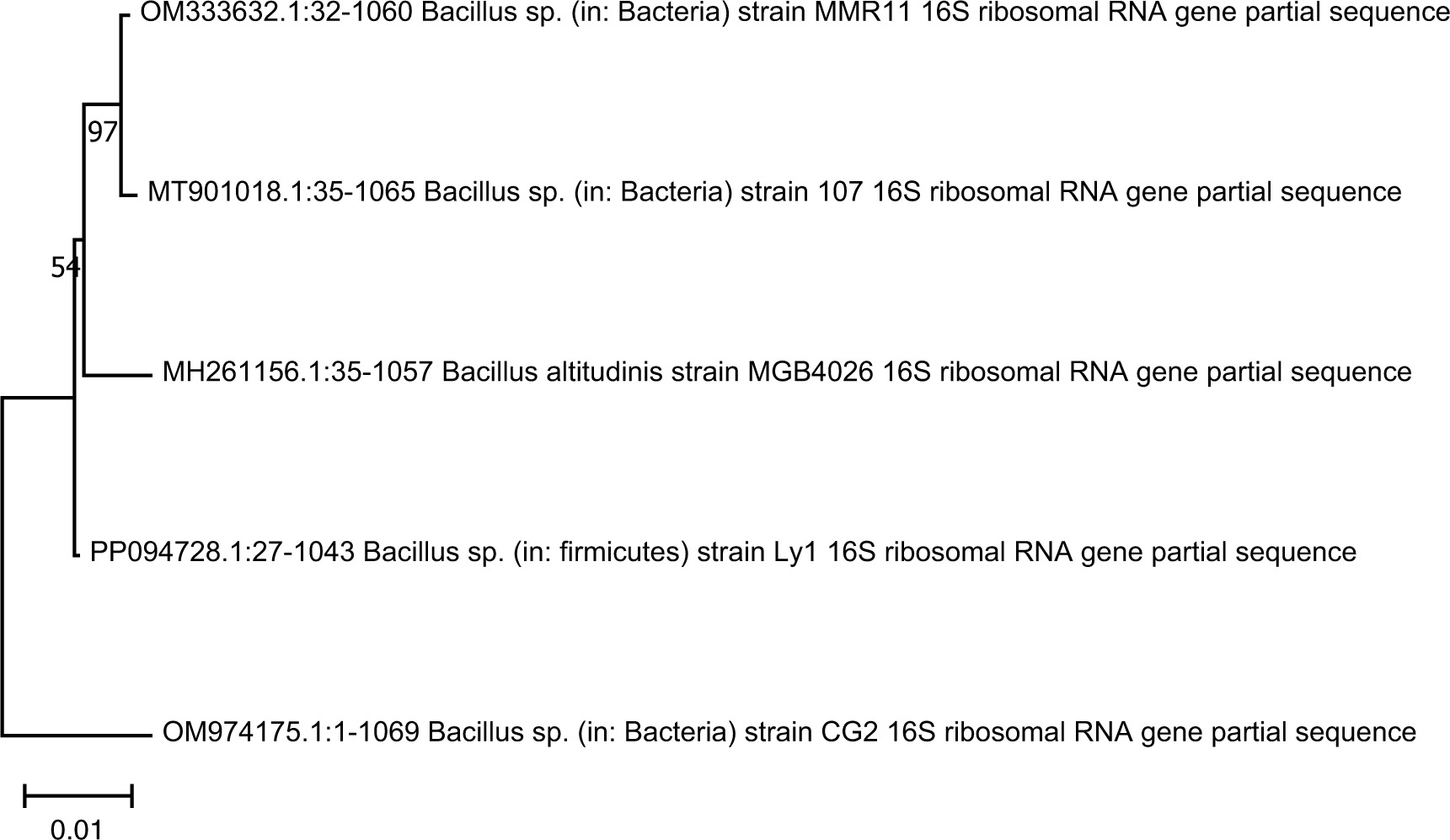 Figure 8. Phylogenetic tree representing CG2 (Bacillus sp. OM974175) cellulolytic isolate showing their evolutionary relationship with closely related species.
