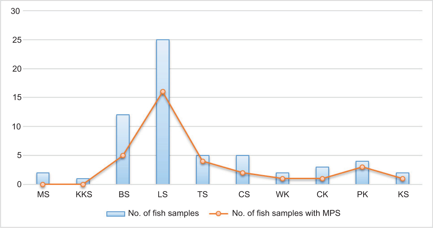 Table 3. Microplastic abundance in fish samples collected at each location and number of microplastics per location.