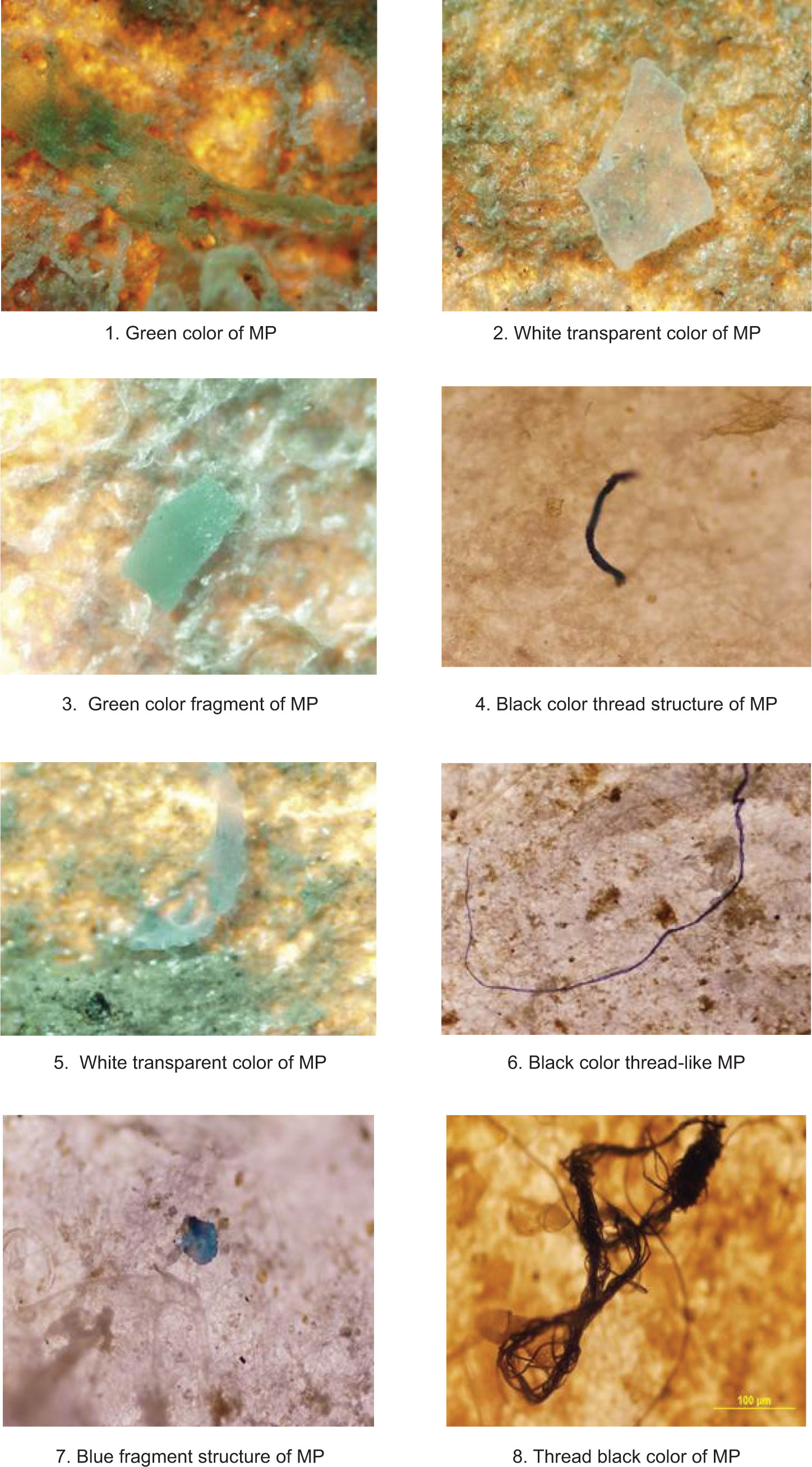 Stereomicroscopic evaluation of MP particles concerning color was carried out; predominant colors identified were green, blue, yellow, and transparent colors (Saeed et al., 2022). Shown in Figure 3 are different colors and shapes of microplastics identified under the microscope.