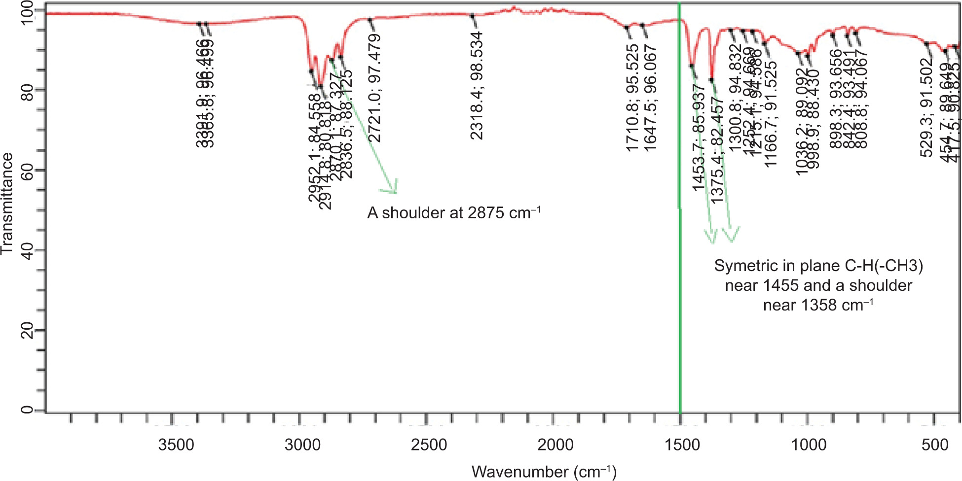 The FTIR spectrum of PP in literature presents a shoulder at 2,875 cm-1, and the asymmetric and symmetric in-plane C–H (-CH3) at 1455 cm-1 and a shoulder at 1,358 cm-1. As observed in Figure 5, FTIR spectra of MPs showed bands at 2,875 cm-1 and C–H (-CH3) stretching near 1,455 cm-1 to confirm that it is a PP.