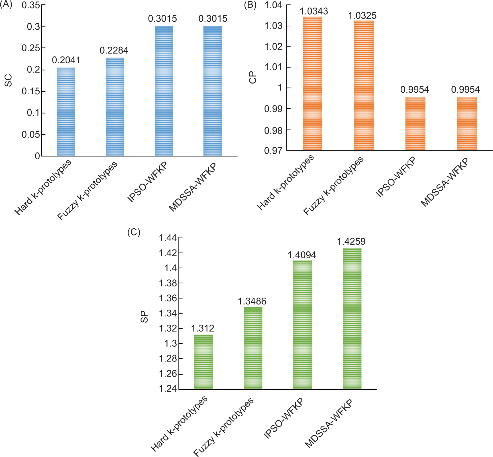 The results show that both MDPSO-WFKP and MDSSA-WFKP algorithms are superior to the Hard k-prototypes and Fuzzy k-prototypes algorithms in terms of accuracy, NMI, ARI, SC, and DBI. Specifically, for the accuracy index, the MDPSO-WFKP algorithm improved by 0.1733, 0.0376, 0.0494, and 0.555, compared to the original Fuzzy k-prototypes algorithm on public datasets, namely Zoo, Heart Disease, Australian Credit Approval, and HCV, respectively, while the MDSSA-WFKP algorithm improved 0.2048, 0.0363, 0.0874, and 0.5571, respectively, showing a significant improvement. In addition, the MDSSA-WFKP algorithm had the best performance on five indexes on the Zoo dataset. On the Heart Disease dataset, it ranked second on four indexes only after the MDPSO-WFKP algorithm and exhibited the best performance in terms of SC. On the Australian Credit Approval dataset, it had the best performance in terms of four indexes. On the HCV dataset, it had the best performance in terms of all indexes. According to the above analysis, it was proved that both MDPSO-WFKP and MDSSA-WFKP algorithms, proposed in this paper, improved the limitations of original algorithm and clustering effectiveness.
