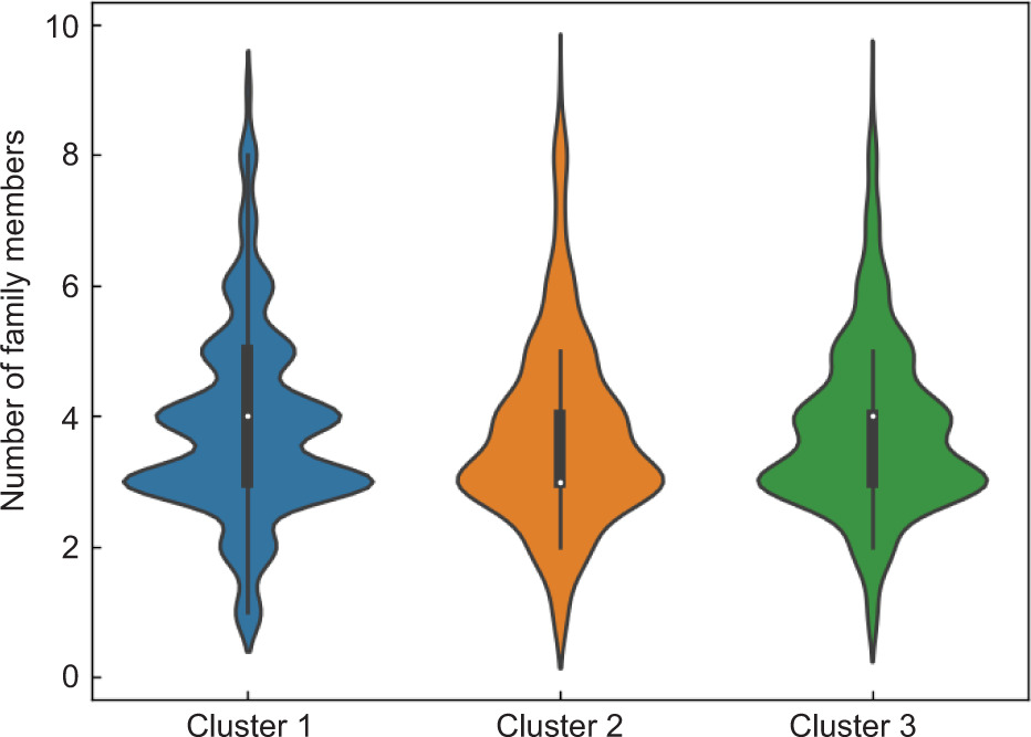 Differences in the characteristics of three sub-categorized consumers are shown in Figures 6–10. Among them, Figure 6 shows the segmentation results of some categorical variables from the perspective of demographic characteristics and behavioral characteristics. Figures 7 and 8 show the segmentation results of the variables of age and number of family members, respectively, in the form of violin plots. Figure 9 shows the regional distribution of segmented groups; and Figures 10 and 11 show the clustering results from the perspective of psychological characteristics and cognition degree of product knowledge, respectively. Specific analysis is to be carried out later.