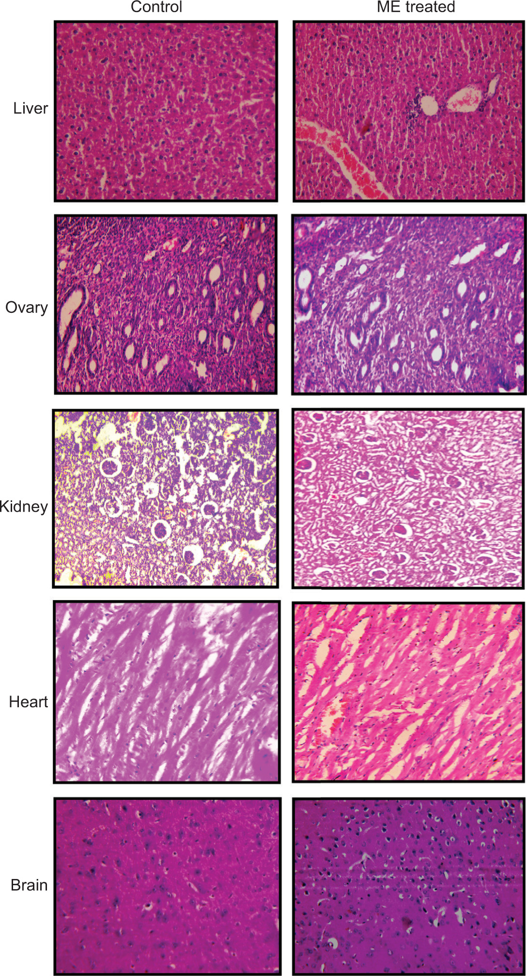 Figure 1. Histopathological effect of MFME on mice liver, ovary, kidney, heart, and brain.