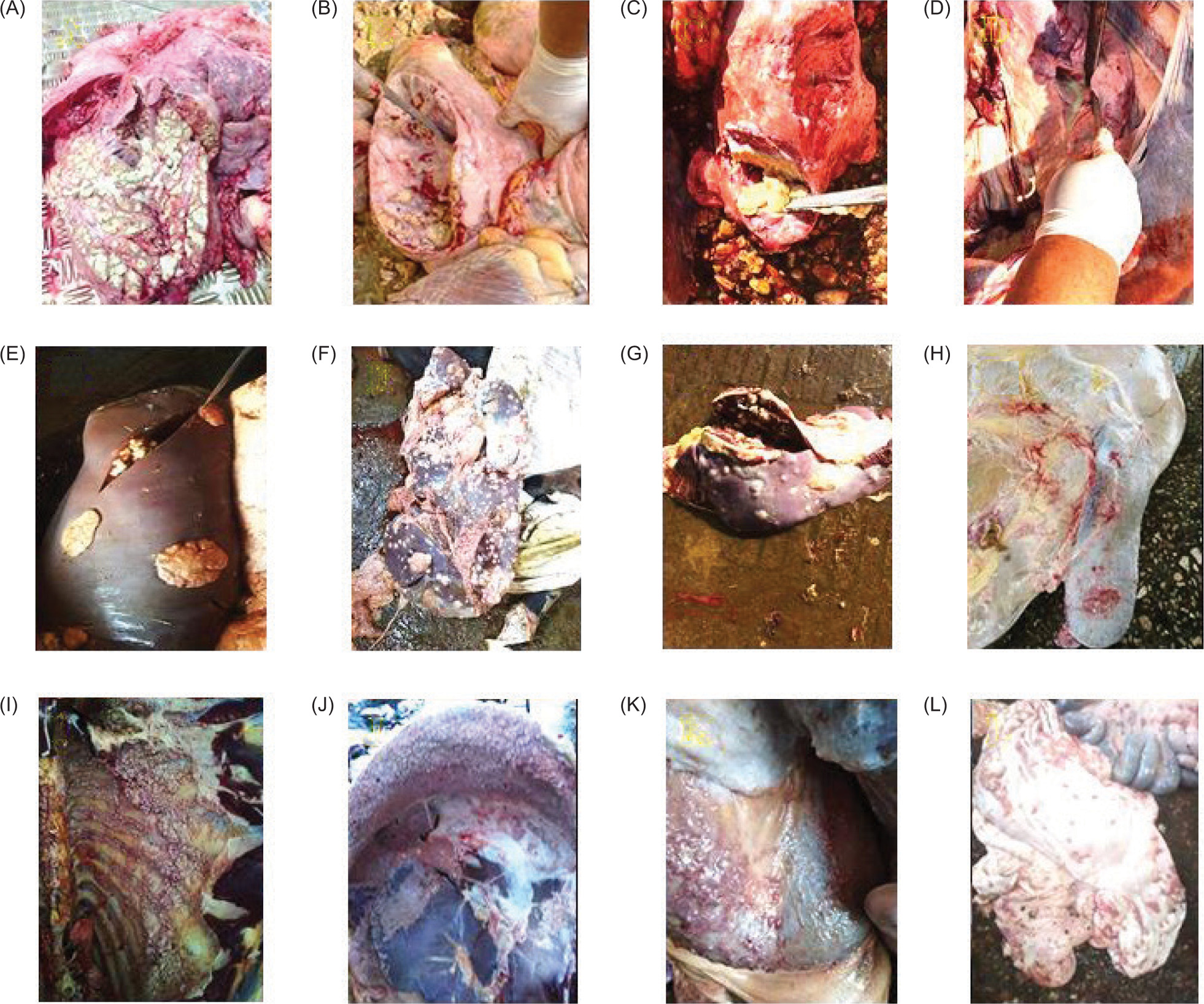 Figure 2. Gross lesions of BTB in different organs of the examined carcass. (A, B) lung has calcified and granulated tubercles in an advanced stage of tuberculosis, (C, D) lung has tubercles with yellowish caseation, (E–G) liver has calcified and granulated tubercles in an advanced stage of tuberculosis, (H) tubercles in spleen, (I) The tubercles lesion appear between ribs and intercostal muscle that indicate the severity and advancement of the infection stage, (J) liver, diaphragm, ribs and intercostal muscle with large numerous tubercles, (K) tubercles in rumen, (L) The tubercles lesion in momentum and intestine.