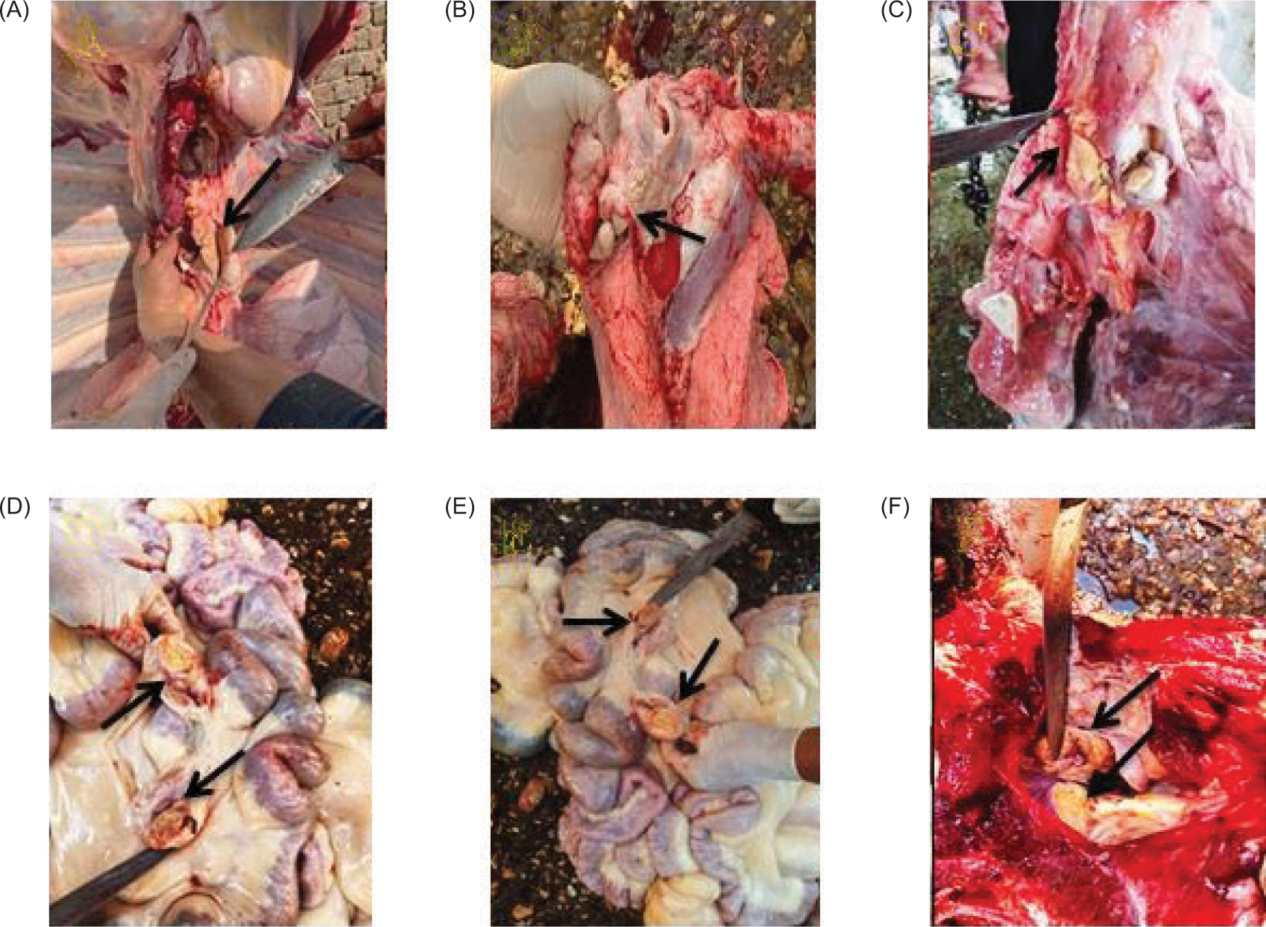 Figure 3. Gross lesions of BTB in different LNs of the examined carcass. (A, B) declared calcified and granulated tubercles in the bronchial LNs, (C) calcified and granulated tubercles in the mediastinal LN, (D, E) Mesenteric LN show calcified and granulated tubercles in the advanced stage of TB, (F) caseated and calcified tubercles in the retropharyngeal LN.