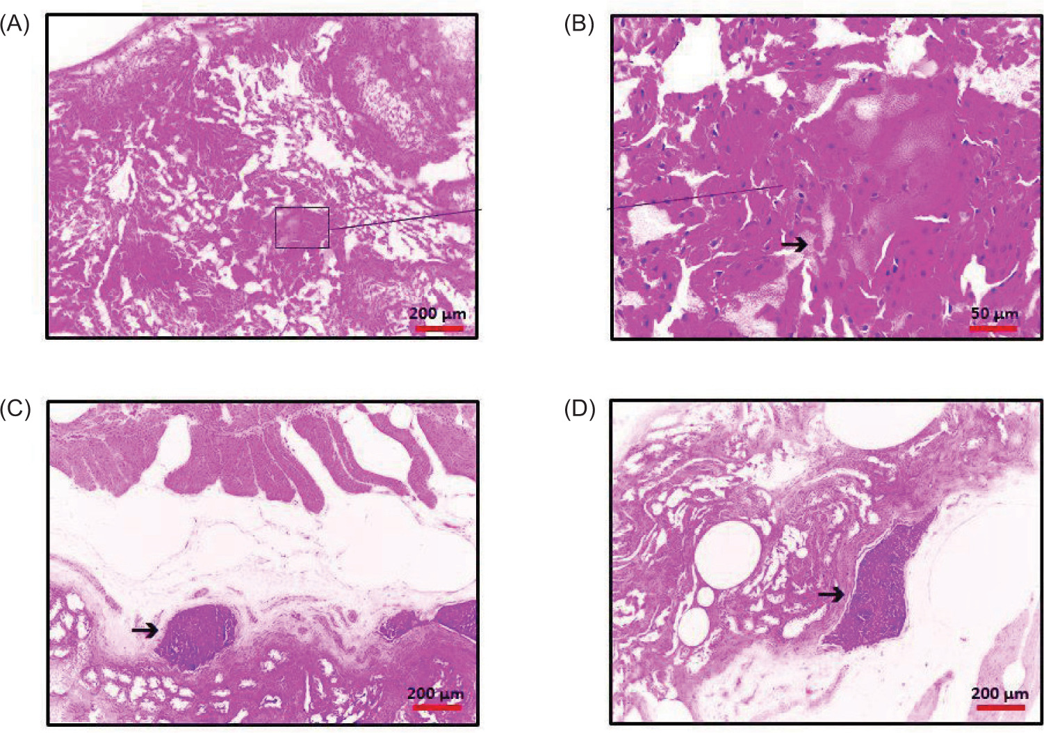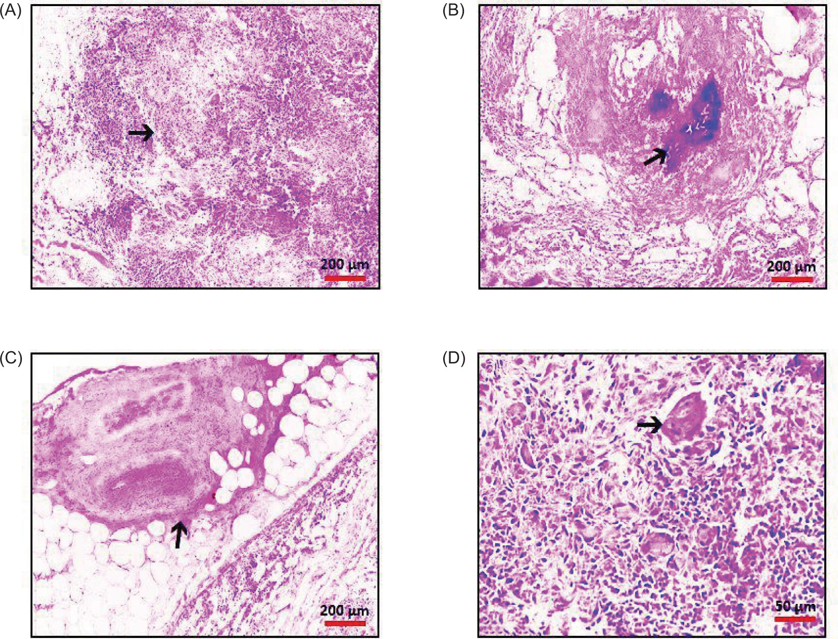 Figure 4. Histopathology sections of infected lungs with M. tuberculosis. (A, B) show a large confluent granuloma with central necrosis and a calcified area surrounded by lymphocytes, macrophage epithelioid cells, and fibrous tissue capsule (arrow). (C) A typical tubercle nodule is noticed in the pleura (arrow). (D) High magnification shows Langhans giant cells (arrow).