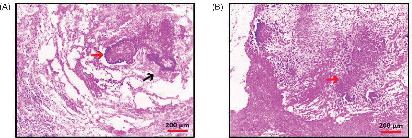Figure 6. Histopathological sections of lymph node with tuberculosis showing TB characteristic typical granuloma with central amorphous granular material (red arrow) surrounded by lymphocytes and Langhans giant cells (black arrow).