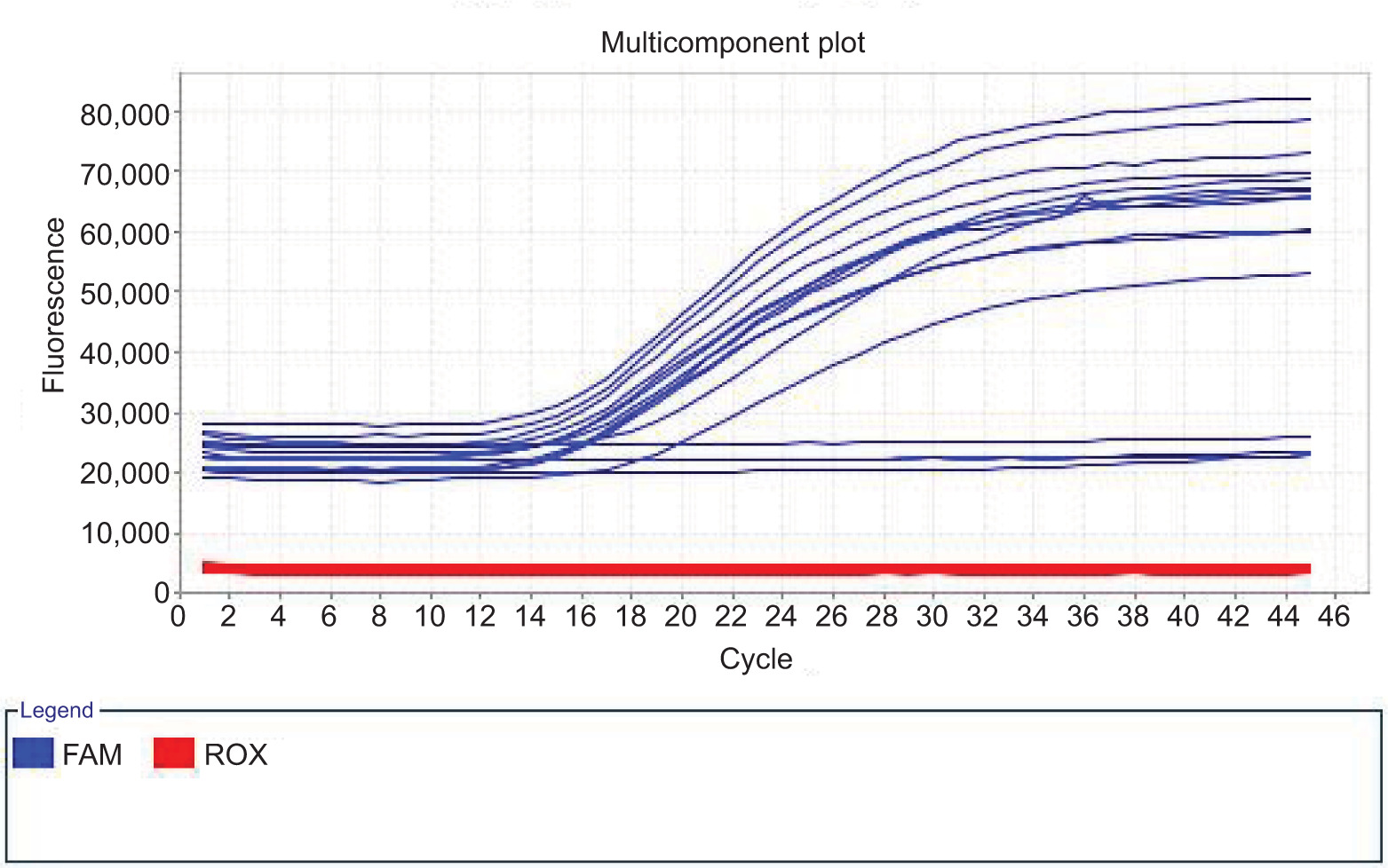 Figure 7. The amplification blot of RT-PCR of tuberculosis samples. Analysis for the amplification blot in its linear form declared that the photo consisted of 8 positive at cycle 12 and two negative examined tubercles samples in addition to one positive and other negative control samples for 45 cycles run using the FAM as a reference dye.
