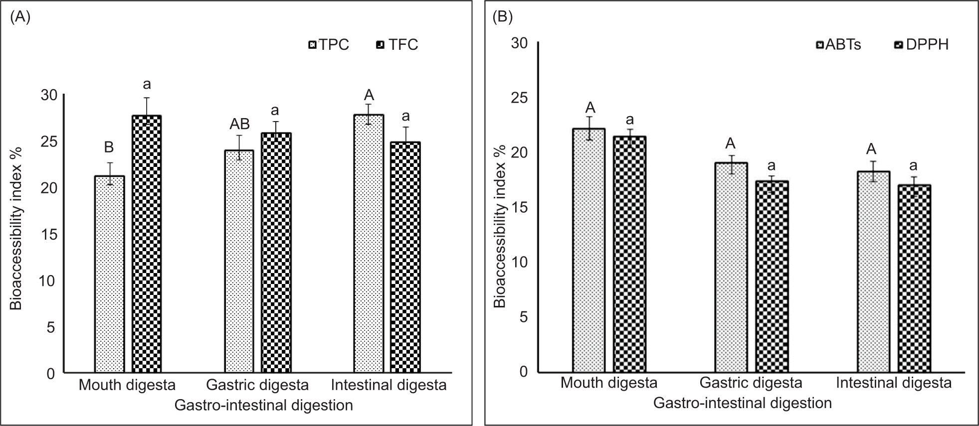 Figure 2. Bioaccessibility index (A and B) of TPC, TFC, ABTS, and DPPH after simulated gastro-intestinal digestion (mouth, gastric, and intestinal phases) of olive pomace.