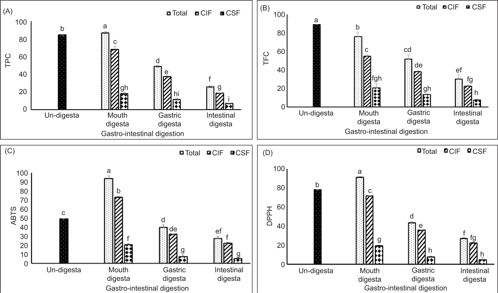 Figure 3 shows the bioactive content of CSF and CIF. In general, the phenolic compounds and antioxidant activity values in CIF were much higher than in CSF. The TPC in CIF after mouth, gastric, and intestinal digestion was 86.43, 37.23, and 18.77 mg GAE/100 g, compared to 18.4, 11.77, and 7.20 mg GAE/1000 g in CSF, respectively. Similarly, after digestion in the mouth, stomach, and intestines, CIF had a higher flavonoid content than CSF, with values of 6.6, 4.6, and 2.6 mg CE/100 g compared to 2.5, 1.6, and 0.9 mg CE/100 g, respectively. After digestion in the mouth, stomach, and intestines, both CIF and CSF exhibited distinct differences in their proportions of DPPH and ABTS scavenging. In oral, gastric, and intestinal digestion phases, CIF had significantly higher ABTS scavenging percentages (73.17, 32.03, and 22.30%, respectively) than the CSF (20.80, 7.53, and 5.0%, respectively). The DPPH scavenging percentages also differed significantly between CIF and CSF at the three digestion phases.