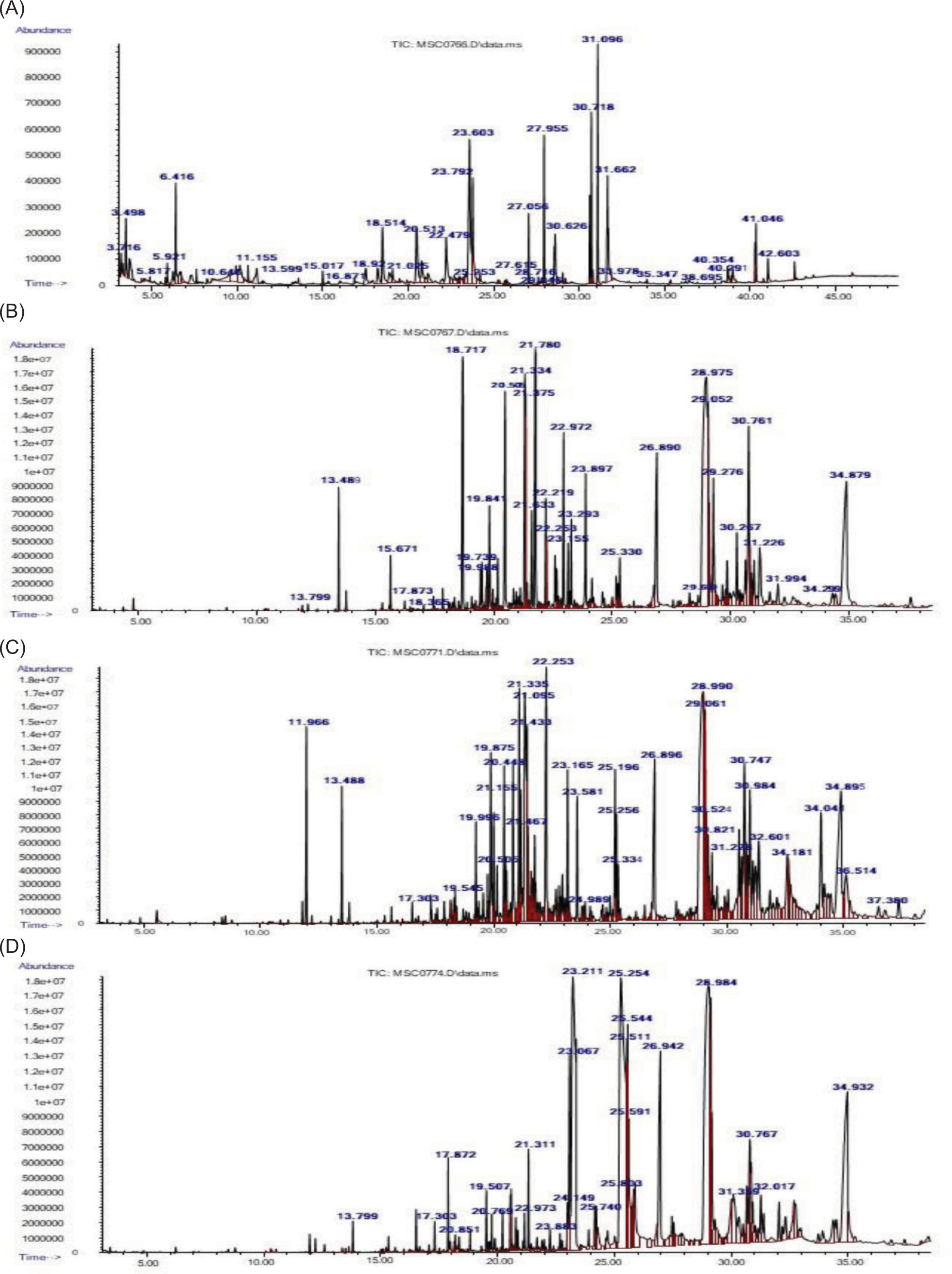 Figure S1. GC-MS chromatograms of (A) undigested olive pomace and pomace chymes from the (B) mouth, (C) gastric, and (D) intestinal phases.