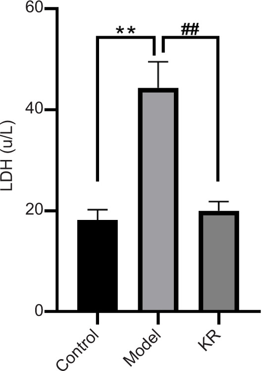 LDH activity was significantly higher in the model group (P<0.01), and KR could decrease the LDH activity (P<0.01) (Figure 2). The results indicated that KR intervention could effectively ameliorate the myocardial injury caused by LPS+ATP on H9c2 cells.