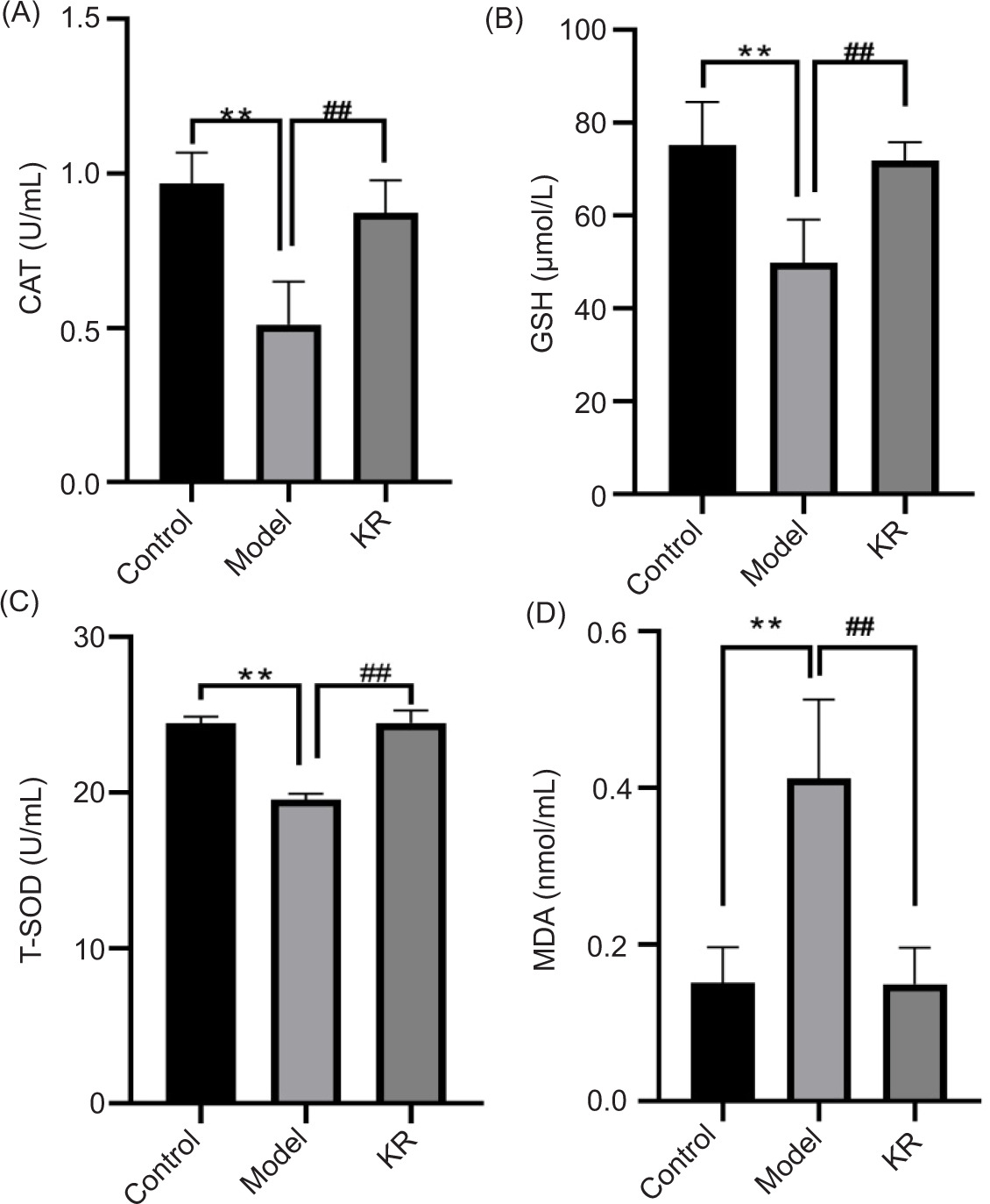 In the model group, CAT, GSH, and T-SOD activities were significantly lower, while MDA content was significantly higher (P<0.01). However, following KR intervention, these oxidative stress indicators were notably reversed (P<0.01) (Figure 3).