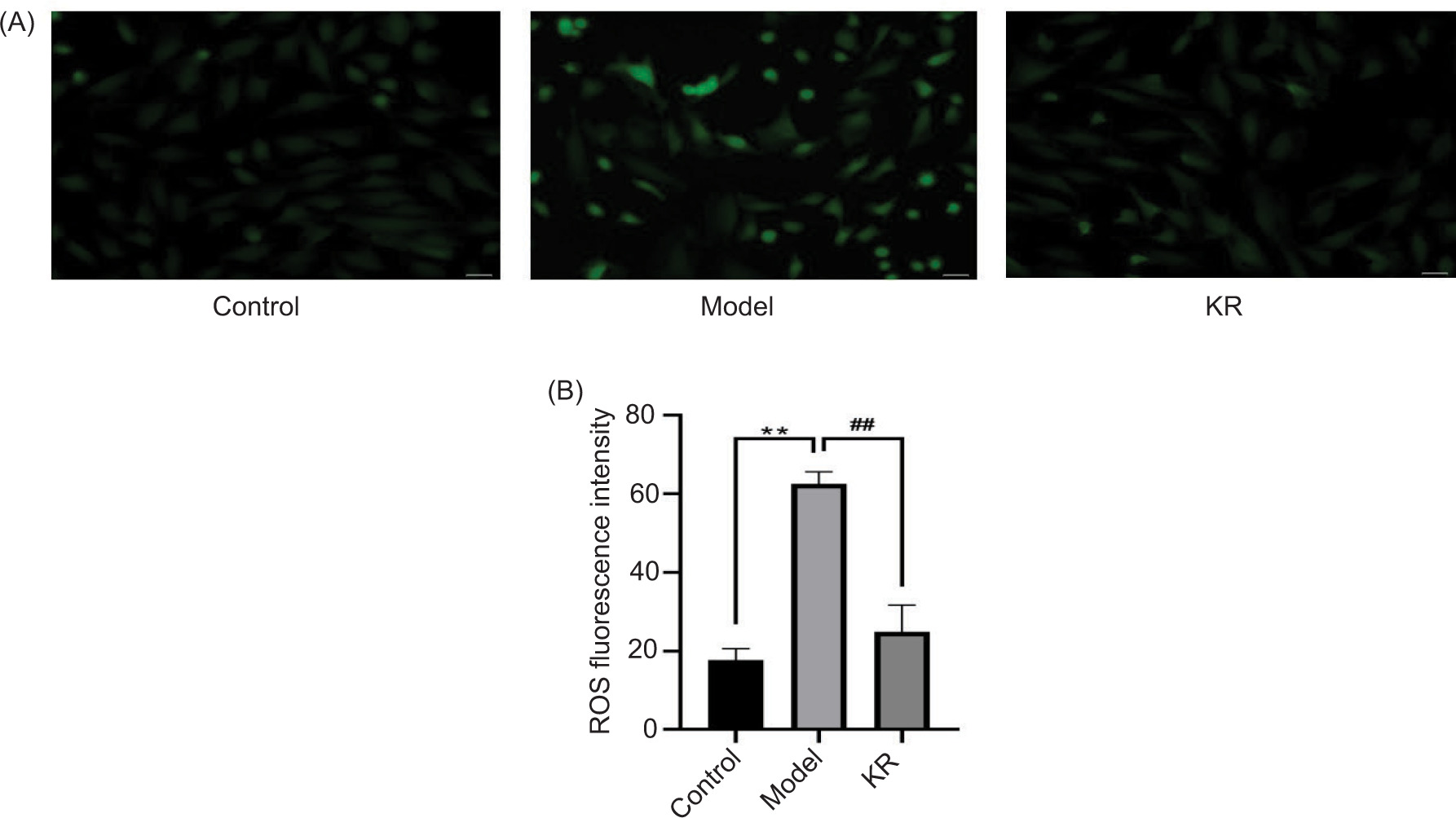 Figure 4. Effect of KR on the level of ROS. (A) Representative image (B) Quantitative analysis. Compared with the control group, **P < 0.01; compared with the model group, ##P < 0.01.