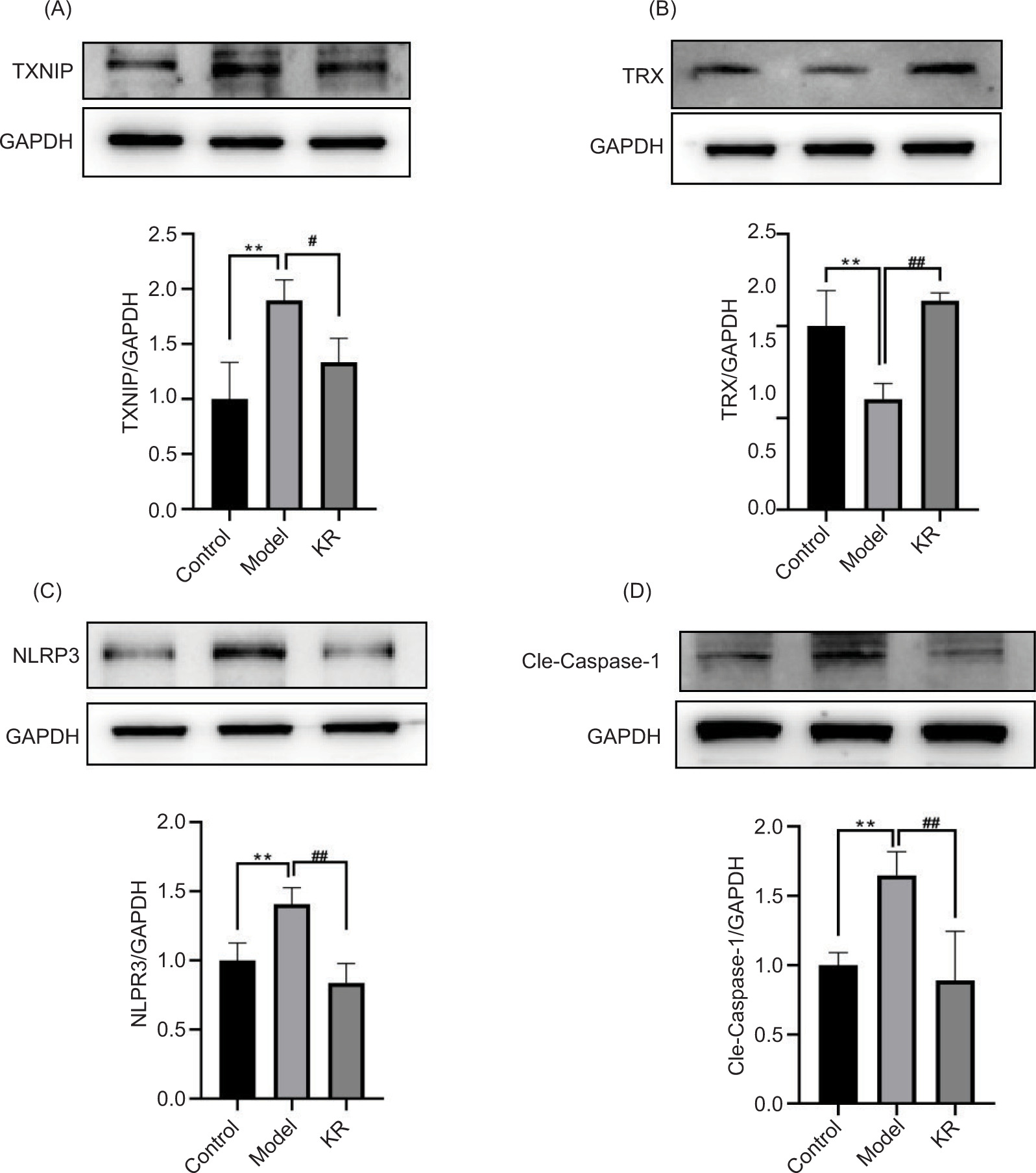Figure 6. KR inhibited the expression of key proteins. (A) TXNIP; (B) TRX; (C) NLRP3; (D) Cleaved-caspase-1. Compared with the control group, **P < 0.01; compared with the model group, ##P < 0.01.