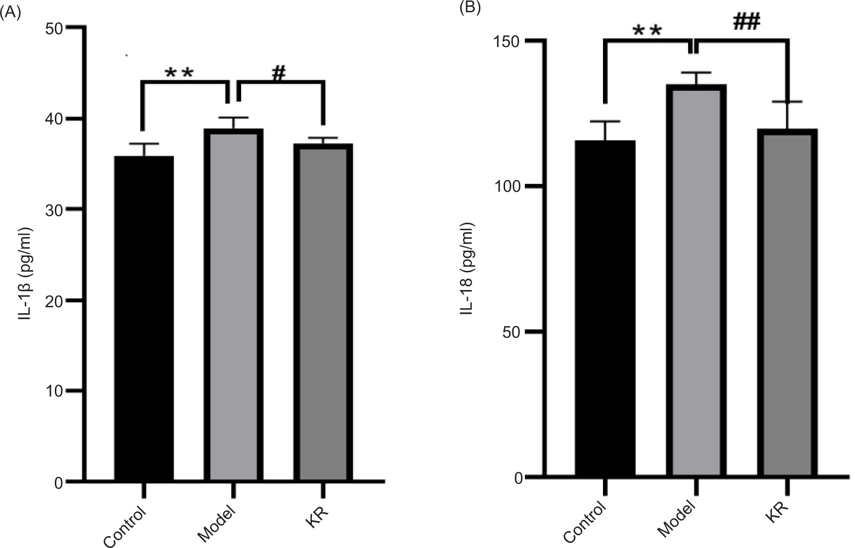 In the model group, the levels of IL-1β and IL-18 were significantly increased (P<0.01). In contrast, KR treatment significantly suppressed these inflammation levels (P<0.01) (Figure 7).