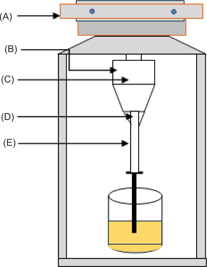 Figure 1. Schematic diagram of ultrasonic measurement system: (A) generator, (B) transducer, (C) booster/amplifier, (D) sonotrode/horn, and (E) cheese.