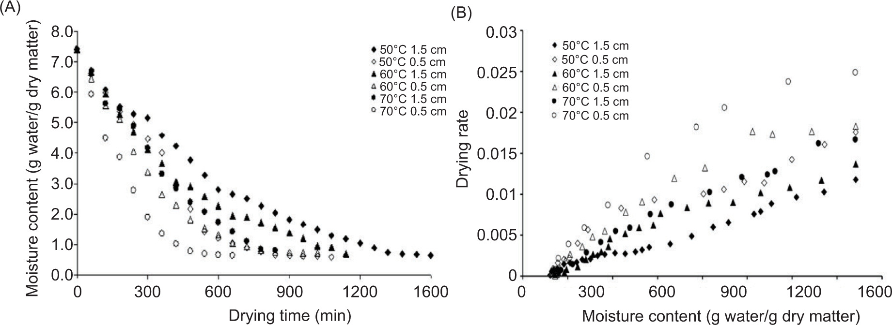 where Mt and Mt+dt are the moisture content at “t” and moisture content at “t + dt” (g moisture/g dry matter), respectively, (t) is the drying time (min), and (dt) is the time derivative (min).