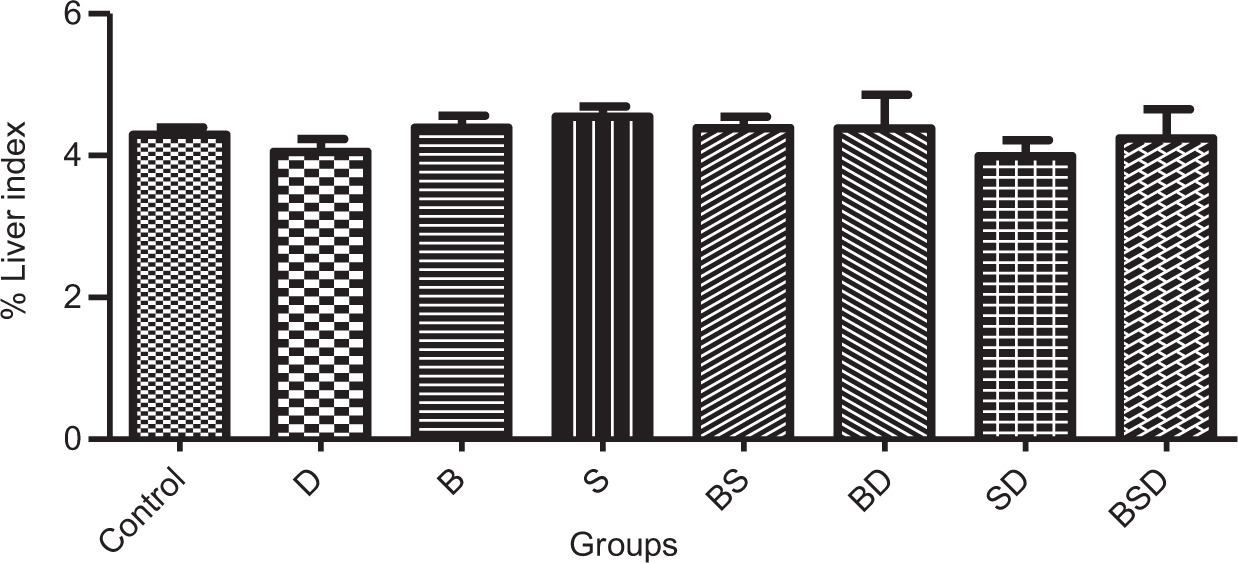 Figure 1. Effect of DLM, Bifidobacteria, and selenium on liver index %. Data represent the mean ± SD of observations from eight rats. asignificantly different from control group at P < 0.05. bsignificantly different from the deltamethrin group at P < 0.05. Control: negative control, D: DLM (positive control), B: Bifidobacterium, S: selenium, BS: Bifidobacterium + selenium, BD: Bifidobacterium + DLM, SD: selenium + DLM and BSD: Bifidobacterium + selenium + DLM.