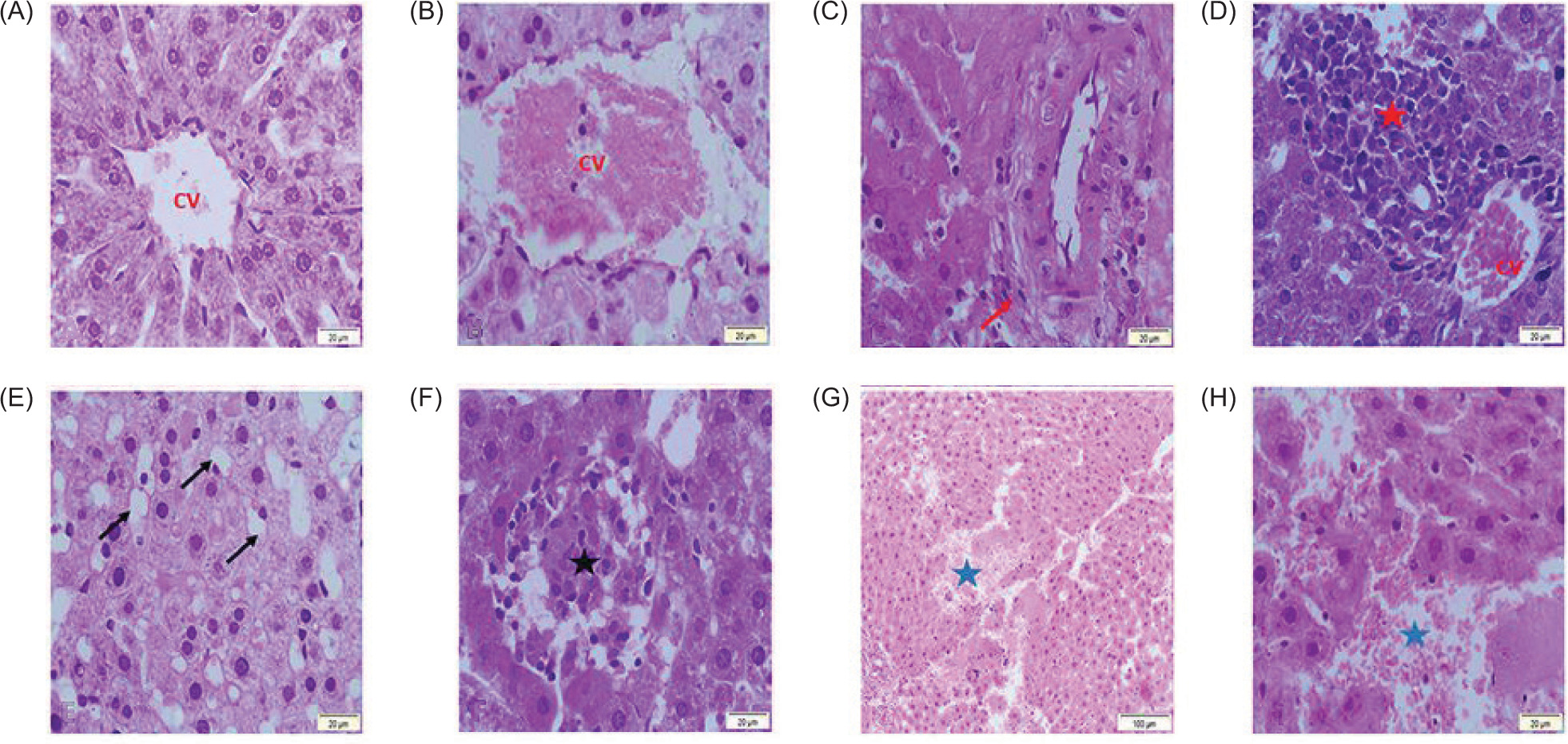 Figure 3. Representative micrograph of the liver of Groups 1 and 2 stained with HE. (A) Control negative group (C) showing normal liver histology, central vein (CV) and hepatocytes. B-H) Deltamethrin treated group (D) showing congestion of the central vein (CV), perivascular fibrosis (red arrow), perivascular mononuclear cell infiltration (red star), vacuolar degeneration (black arrows), focal necrosis with mononuclear cell infiltration (black star), and focal areas of hemorrhages (blue stars).