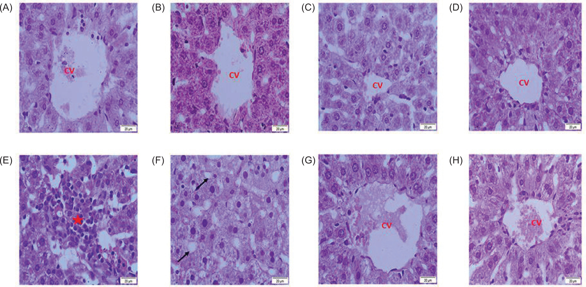 Figure 4. Representative micrograph of the liver of the in Groups 3–8 stained with HE. (A, B, C) Bifidobacteria-treated group (B), selenium (S) treated group and Bifidobacteria- + selenium-treated group (BS) displayed the normal structure of the liver with normal central vein (CV). D, E) Bifidobacteria + deltamethrin treated group (BD) showing vacuolar degeneration and mononuclear cell infiltration (red star). (F, G) Selenium + Deltamethrin treated group (SD) showing vacuolar degeneration (black arrows), nuclear pyknosis and congestion & dilation of central vein (CV). H) Selenium + Bifidobacteria + Deltamethrin-treated group (BSD) showing hepatic cells are getting better and have normal architecture.