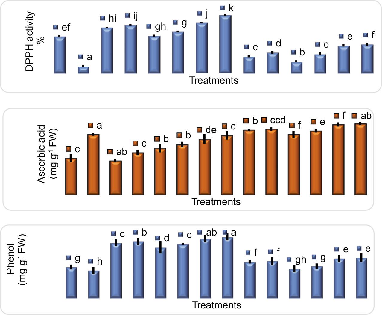 Enzymatic and non-enzymatic antioxidants make up plant antioxidant defense systems, which play important roles in a variety of biological processes and responses to environmental factors (Naveed et al., 2025; Xu et al., 2012). According to Saad et al. (2018), this detoxification system lessened the harmful effects of metal toxicity caused by the ROS ameliorative system. The constant production of ROS during photosynthesis is scavenged by different antioxidant enzymes, which aid in controlling electron transport (Gill and Tuteja, 2010). In plants, proline, phenol, and ascorbic acid are primarily involved in non-enzymatic detoxification processes. H2O2 is produced from O•- through the process of detoxification. According to the study findings, proline, phenol, and ascorbic acid activities increased with administration of Cr. Triacontanol affects antioxidant enzymes that aid in the scavenging of reactive oxygen, which increases photosynthetic activity and preserves redox state. Triacontanol modulates antioxidant enzymes that aid in the elimination of ROS, which increases photosynthetic activity and preserves the redox state. Similar to our current findings, Yadav and Singh (2023) reported a modest increase in phenolic content after exogenous supplementation with phytohormones. Antioxidants called phenols are able to bind metal ions and lessen their harmful effects (Ahmed et al., 2023). Consequently, the higher DPPH activity and phenolic content of the TRI-treated R. sativus seedlings increased their antioxidant capacity, thereby alleviating Cr toxicity and promoting development.