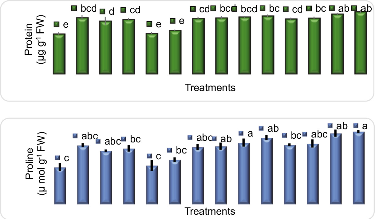 In the current study, the plant protein concentration was decreased by Cr phytotoxicity. The accumulation of Cr in the plant, which results in the breakdown of soluble proteins in the cell, is the reason for this decrease in protein concentration. The seed primer and foliar application of TRI resulted in greater amounts of protein for cell integrity and better resistance to metal stress.