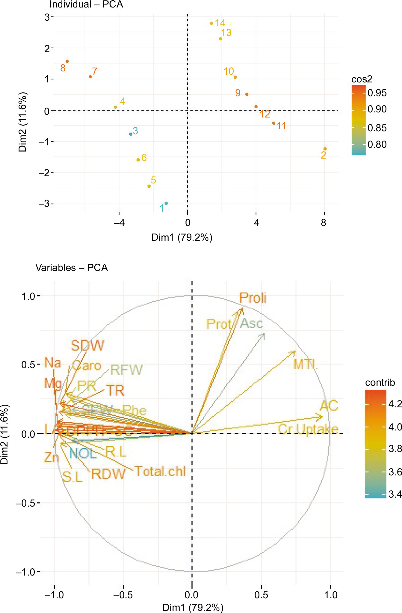 R. sativus grown on Cr-contaminated soil with exogenously applied TRI was shown to be associated with growth parameters and physio-biochemical traits by loading plots from the analysis of principal components (Figure 4). A total of 90.8% of the entire database consisted of two primary components, Dim 1 and Dim 2, which made up the largest proportion of all the components. Dim 1 consisted of 79.2% whereas Dim 2 consisted of 11.6% of the whole dataset. The first set of variables, PC1, was positively correlated with Mg+2, Na+, Zn+2, fresh root weight, dry root weight, fresh shoot weight, dry shoot weight, photosynthetic rate, phenol content, stomatal conductance, carotenoids, DPPH free radical scavenging activity, total chlorophyll, transpiration rate, shoot length, root length, and number of leaves. Factors related to proline, protein, and ascorbic acid contents, MTI, and accumulation coefficient were strongly related negatively to PC1 variables.