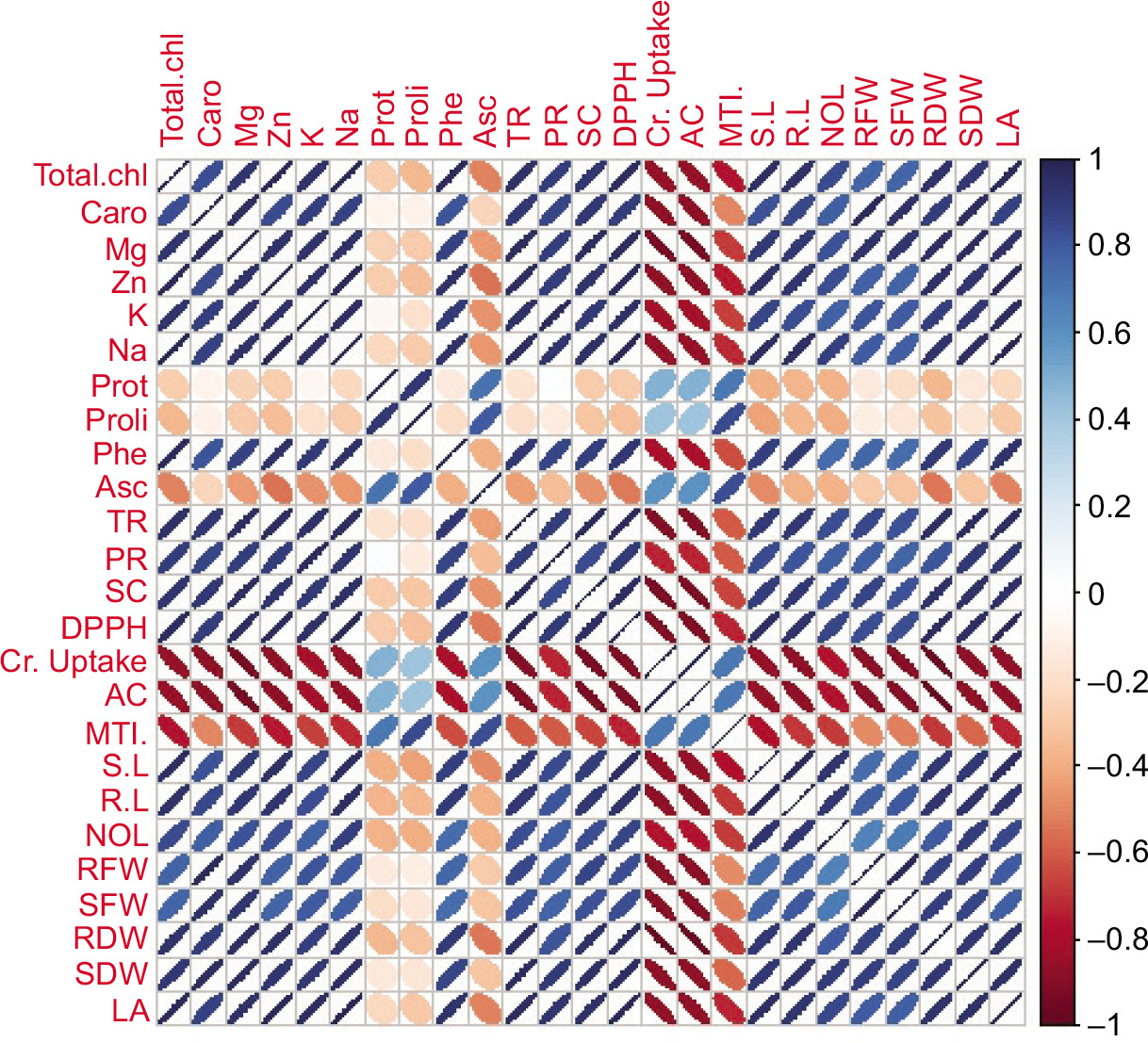 Figure 5. Pearson correlation of impact of triacontanol (TRI) on the growth and physio-biochemical analysis of R. sativus against Cr stress.