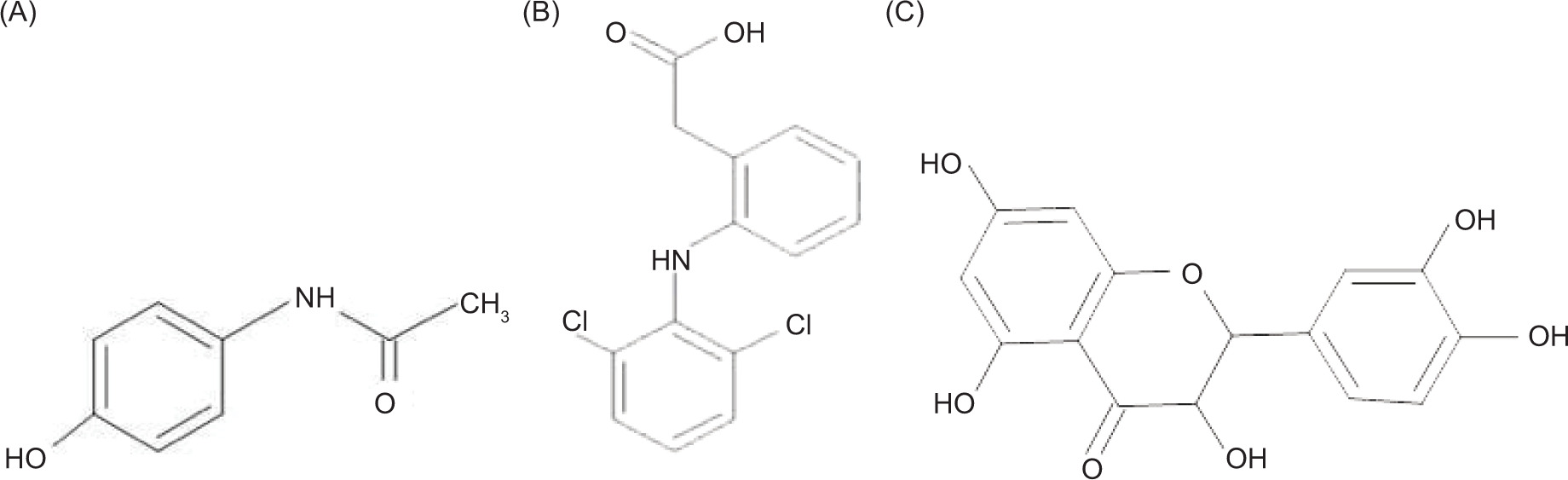Figure 1. Show 2D structure of ligand (A) Diclofenac, (B) Paracetamol, and (C) Quercetin.