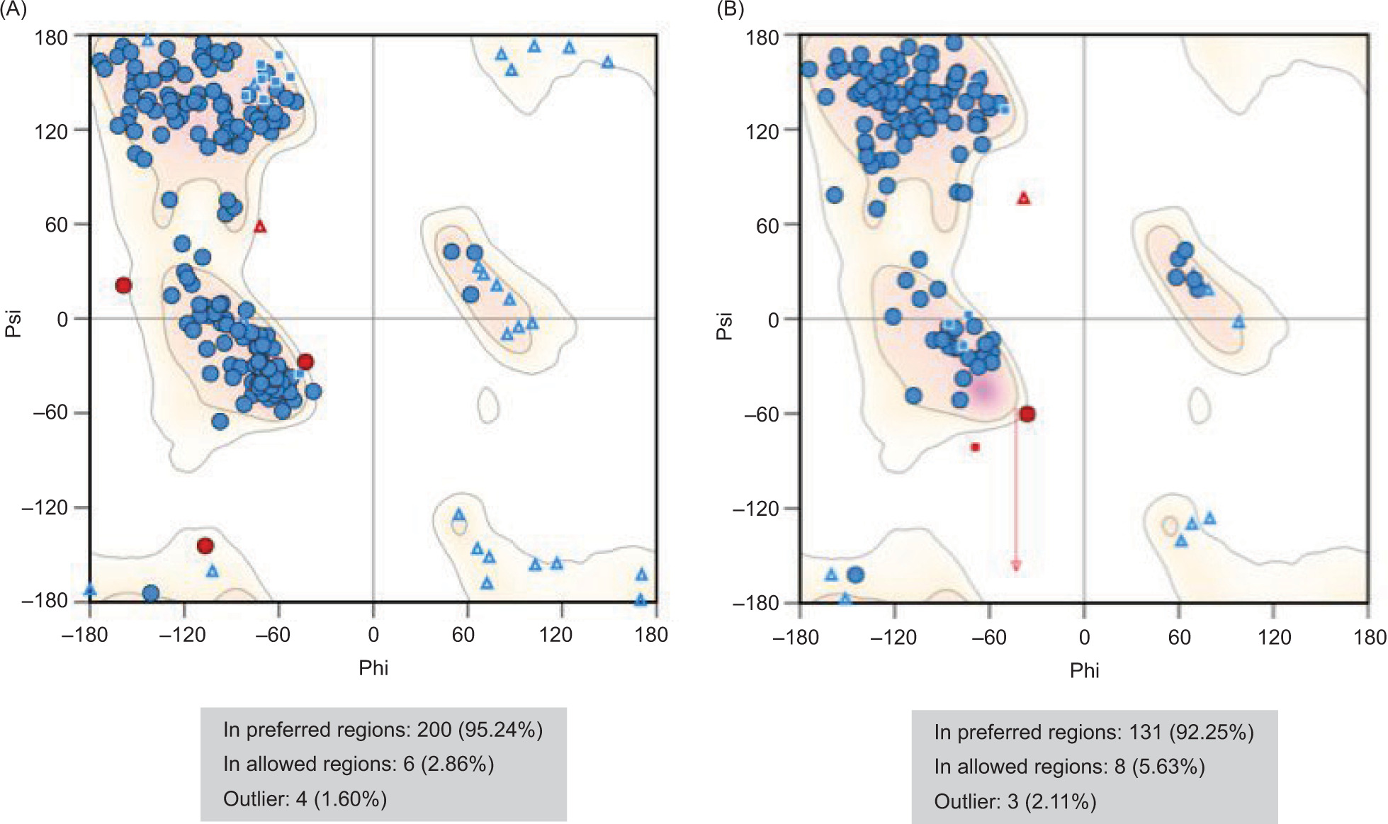Figure 2. Showing Ramachandar plot (A) 1bp4 (B) 4x37.