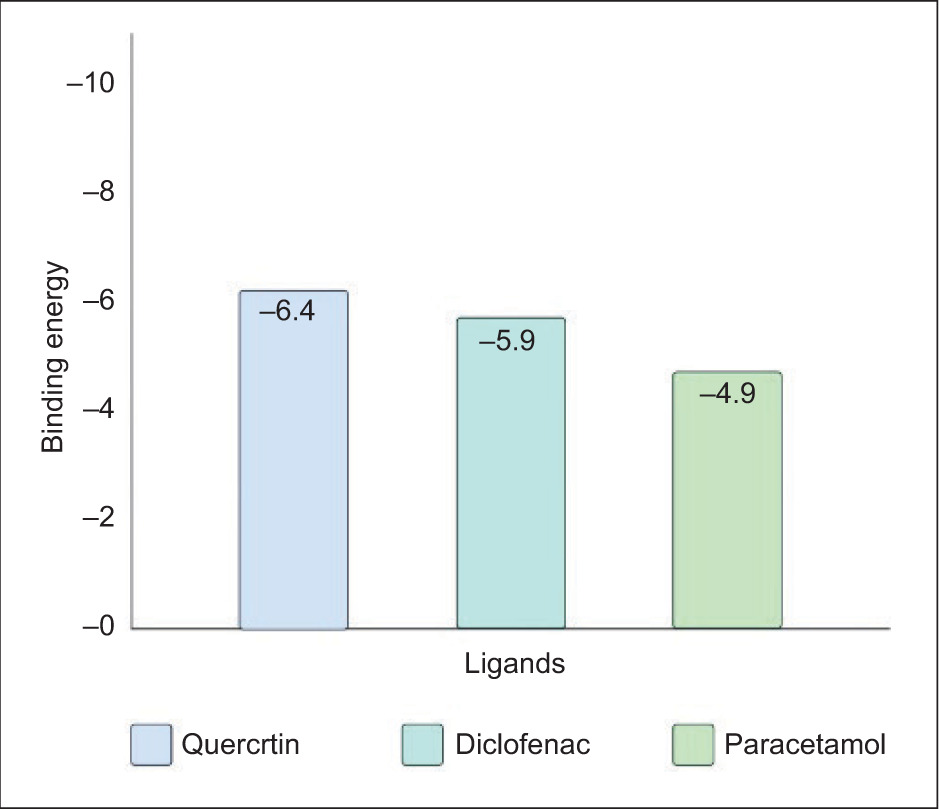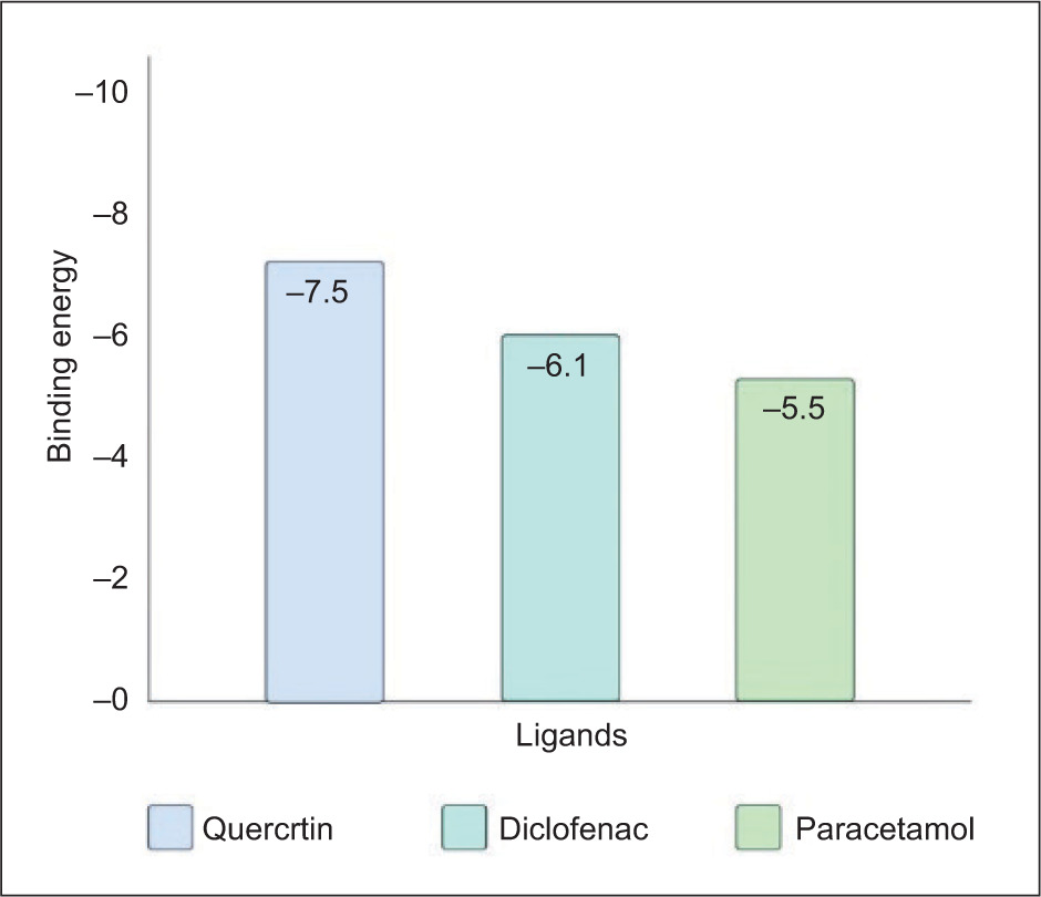 In anti-inflammatory activity, all three compounds that are selected and analyzed dock into the binding site of 1bp4 perfectly. The ability of quercetin and its analogs to bind was found to be highest at −6. And for diclofenac, it is −5 kcal/mol compared to the earlier value of 4 kcal/mol. That is, for each, the actual enthalpy change of reaction for acetylsalicylic acid is 9 kcal/mol, while for paracetamol it is −4 kcal/mol–9 kcal/mol. The more negative the value is, the relatively high binding affinity of the ligand to the active site of protein, which is demonstrated in Figure 7.