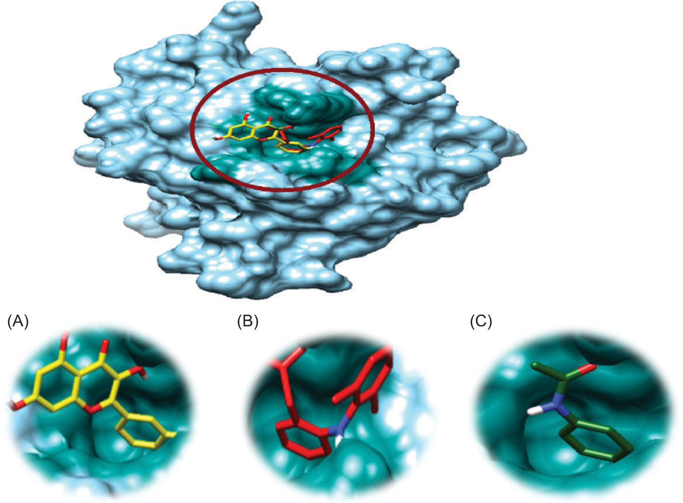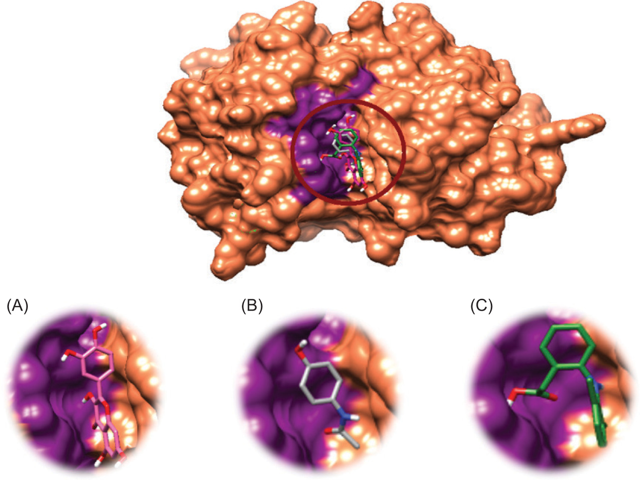 Figure 9. Showing the surface of 1bp4 with (A) Quercetin (B) Paracetamol (C) Diclofenac.