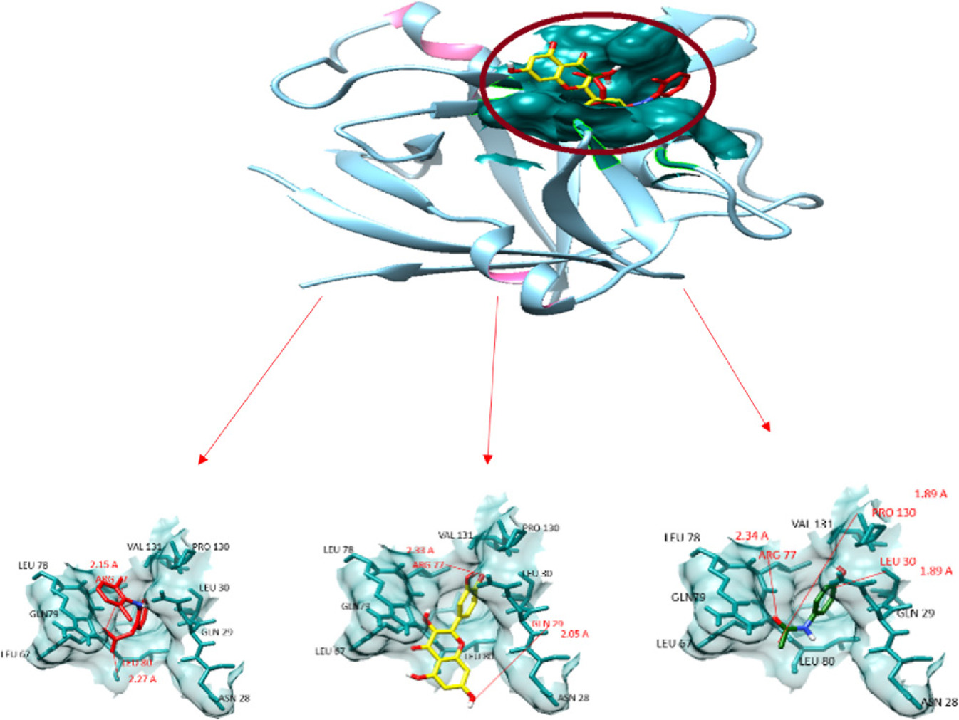 Interleukin-1 (4x37) was involved in the antipyretic activity. Quercetin is found in methanol fruit extract of C. papaya and diclofenac, and paracetamol is a standard drug is docked with 4x37. It was evident that quercetin had a very high binding affinity of −7. 5 kcal/mol, diclofenac had −6.1 kcal/mol, and paracetamol had −5.5kcal/mol, as shown in Figure 8.