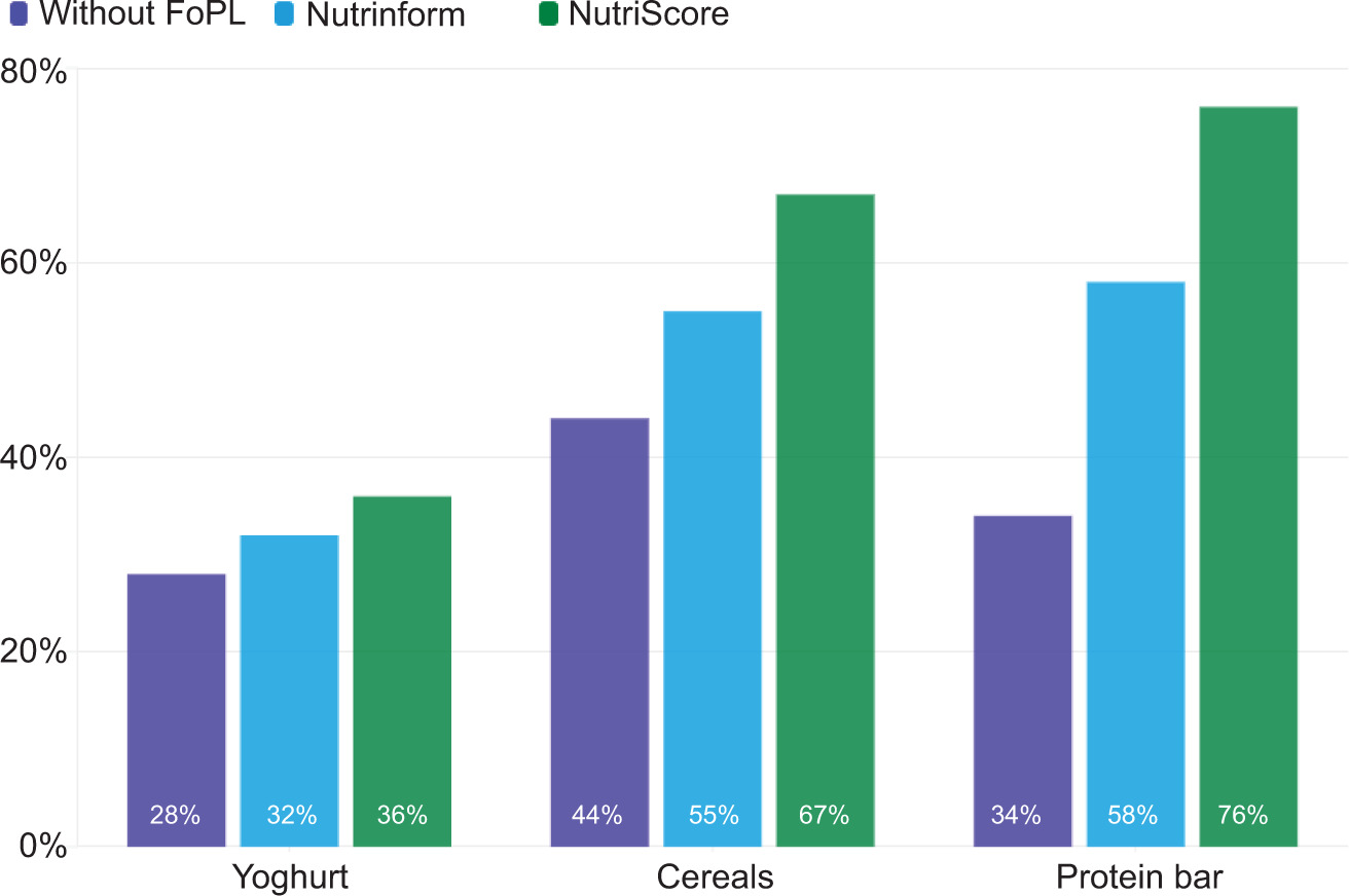 From a global perspective, we were unable to confirm a consistent, statistically significant difference between the impact of individual labels on improving consumer choice, but it is clear that the nature of the product also plays a role in the application of these indicators. The most notable disparities in consumer choice enhancements at the level of individual products are particularly visible in the case of protein bars. These disparities are also statistically significant, with NutriScore playing a substantial role in facilitating a more prominent improvement (Z-Test for ratios, 0.003).