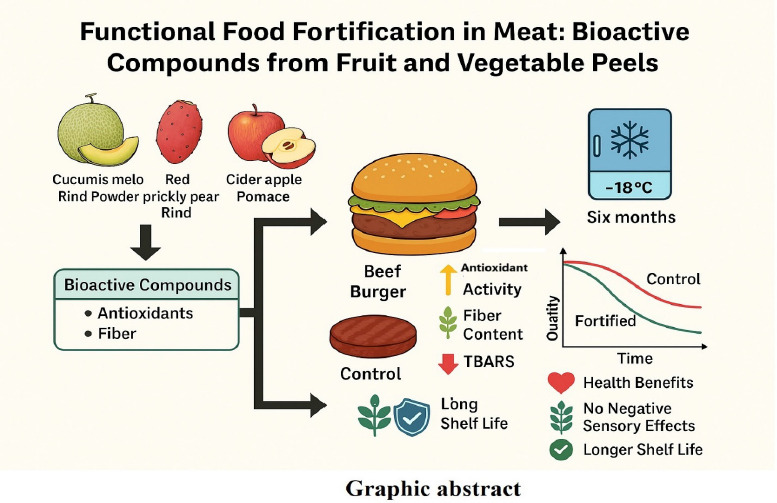 In this work, the impacts of Cucumis melo rind powder (CMRP), Red prickly pear (RPP), and Cider apple pomace (CAP) were evaluated in terms of profiling of bioactive compounds. It could be concluded that the addition of different concentrations of RPP, CMRP, and CAP improved the quality criteria and significantly (P ≤ 0.05) increased the values of total phenolic compound (TPC), antioxidant activity, and fiber content of beef burger during frozen storage. The antioxidant effects of RPP, CMRP, and CAP to retard protein and lipid oxidation were investigated in beef burgers during frozen storage at −18 ± 2°C for 6 months. Powders of RPP rind, CMRP, and CAP were incorporated into freshly minced beef at different concentrations (RPP: 1, 2, and 3%; CMRP: 2, 3, and 4%; and CAP: 2, 4, and 5%) and compared with the control sample. Chemical compositions of the prepared beef burgers, total volatile nitrogen (TVN), thiobarbituric acid (TBA) reactive substances, TPC, and antioxidant activity (DPPH) were determined. Results indicated that powders showed high phenolic content and antioxidant activity, especially RPP. The addition of different concentrations of RPP, CMRP, and CAP caused high storage stability and reduced values of TBA and TVN in prepared beef burgers during frozen storage compared to the control sample. Enrichment of red meat with CMRP, RPP, and CAP has improved hygienic and safety properties than unfortified products without leading to changes like rapid spoilage and consequent reduction in shelf life.