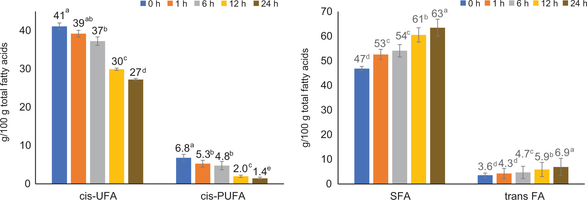 Figure 2. (Panel A) The overall decrease in the contents of total cis-unsaturated fatty acids (cis-UFA) and cis-polyunsaturated fatty acids (cis-PUFA), and (Panel B) increase in the contents of saturated fatty acids (SFA) and trans fatty acids (tFA) during 0-, 1-, 6-, 12- and 24-h heating of four types of hydrogenated fats/ghee. Mean values with different letters differ at p < 0.05.
