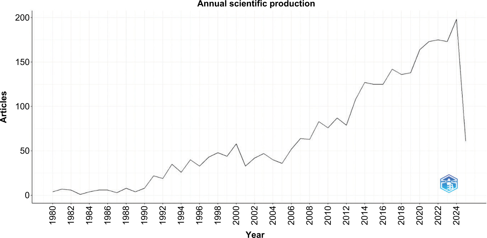 When the data set was analyzed, it was observed that the number of articles increased at an annual growth rate of 6.24%, with publications spanning from 1980 to 2025. The articles in the data set were produced by a total of 16,772 researchers; 189 of the articles were single-authored, and 44.11% of the articles were conducted through international collaboration. In addition, it was determined that the analyzed articles referenced a total of 100,029 sources.