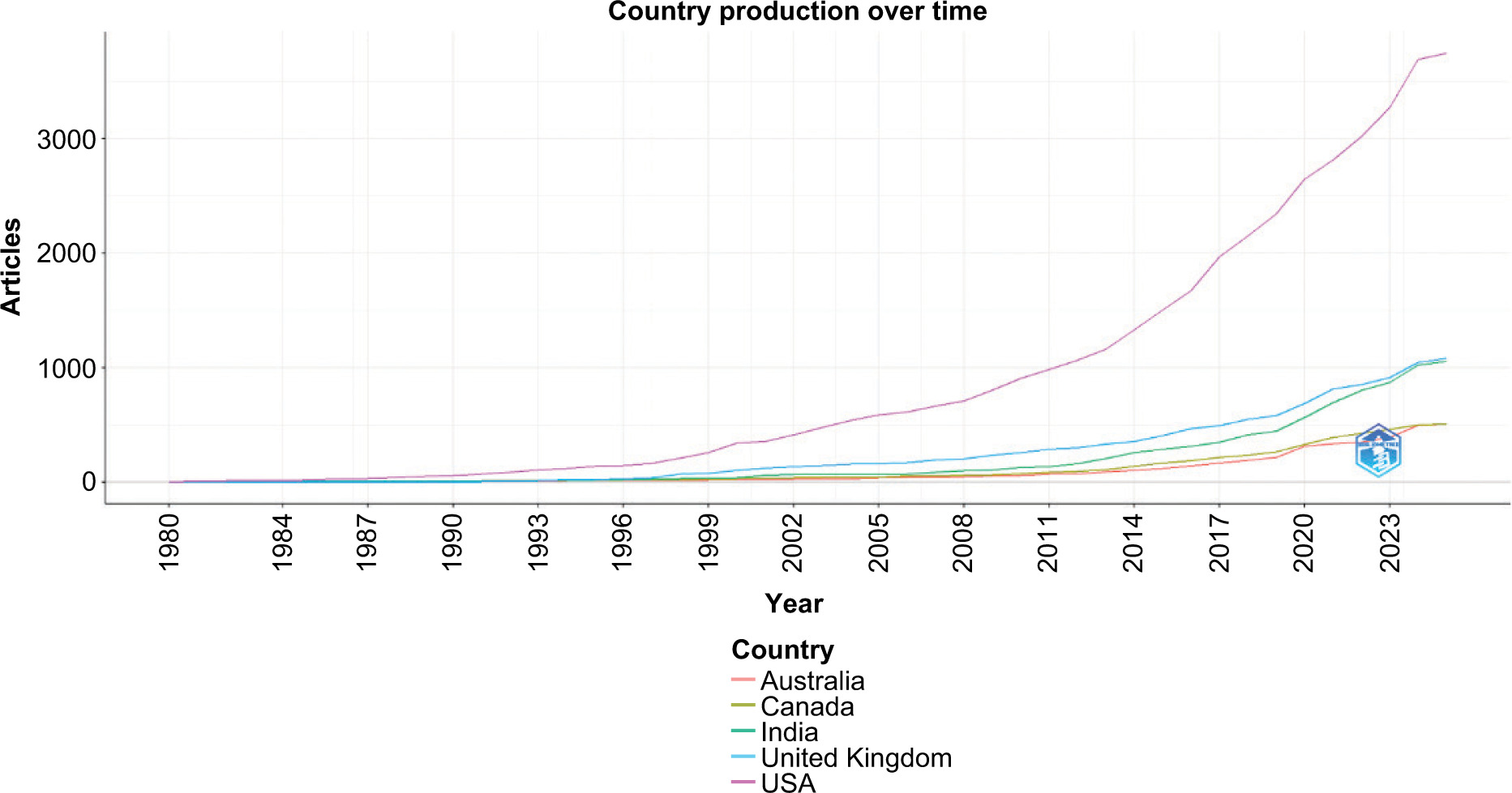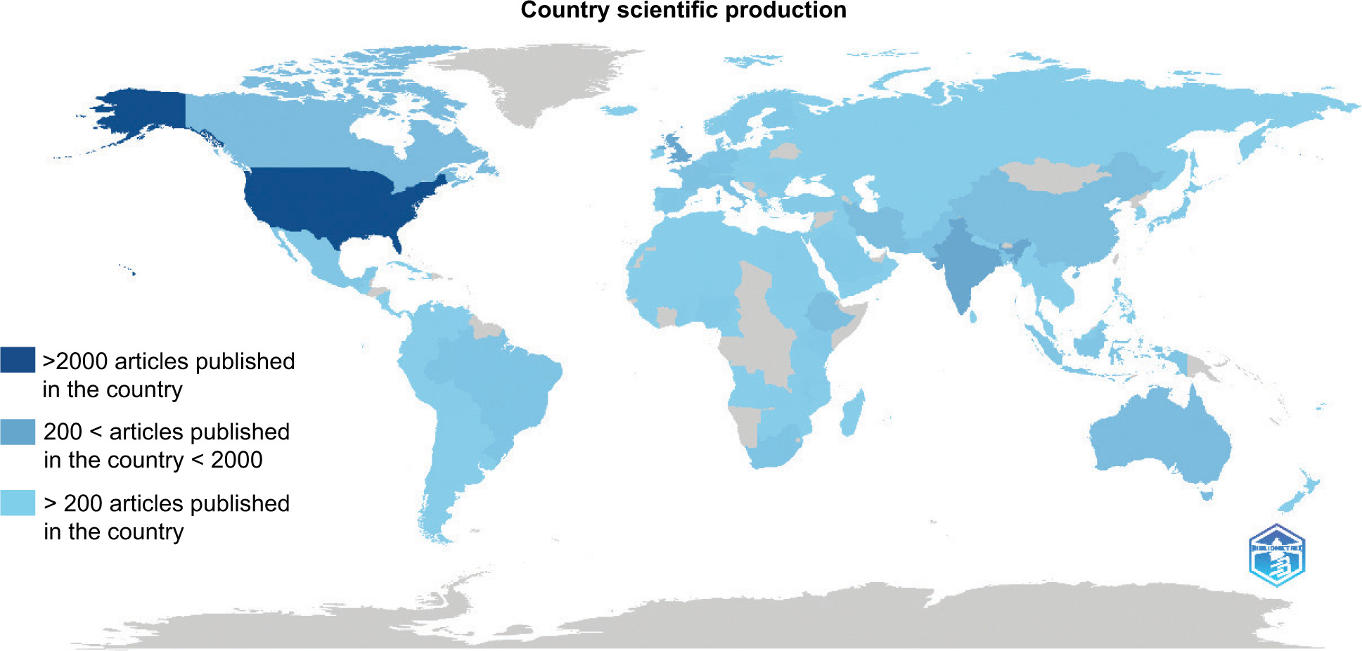In the world map shown in Figure 4, the dark blue color indicates a high number of articles on the subject. As the shade of blue becomes lighter, the number of studies conducted decreases. Areas in grey represent countries where no research on the subject was found. When the number of articles by country was analyzed, it was determined that the USA (n=3,743), United Kingdom (n=1,081), India (n=1,054), Canada (n=507), and Australia (n=498) had the highest number of articles in the data set. In the relevant data set, it was also shown that 112 articles were produced in Turkey, indicated with light blue color.