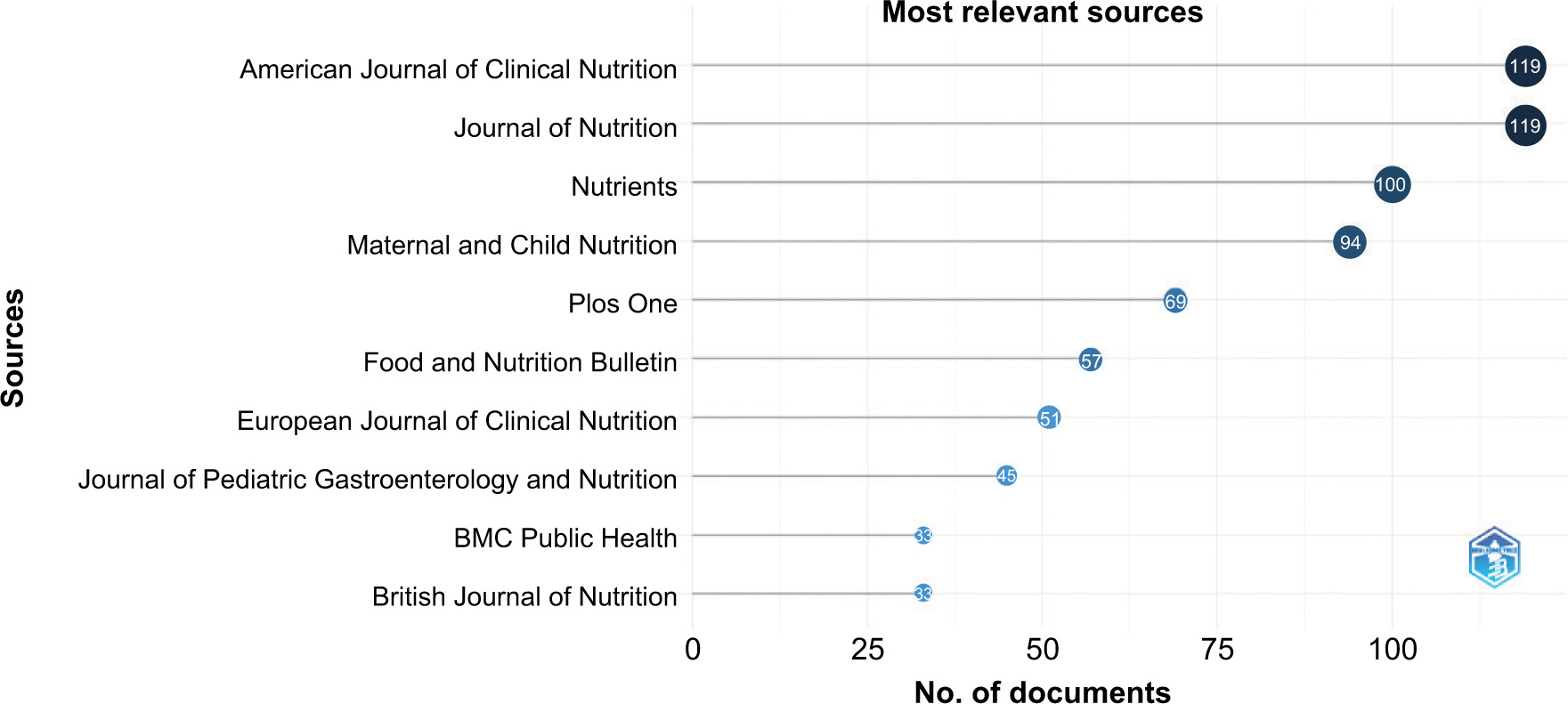 When Figure 6 was analyzed, it was observed that most research on the relevant subject was published in the American Journal of Clinical Nutrition (n=119), Journal of Nutrition (n=119), Nutrition (n=100), and Maternal and Child Nutrition (n=94). These journals were followed by the others indicated in the graph in Figure 5.