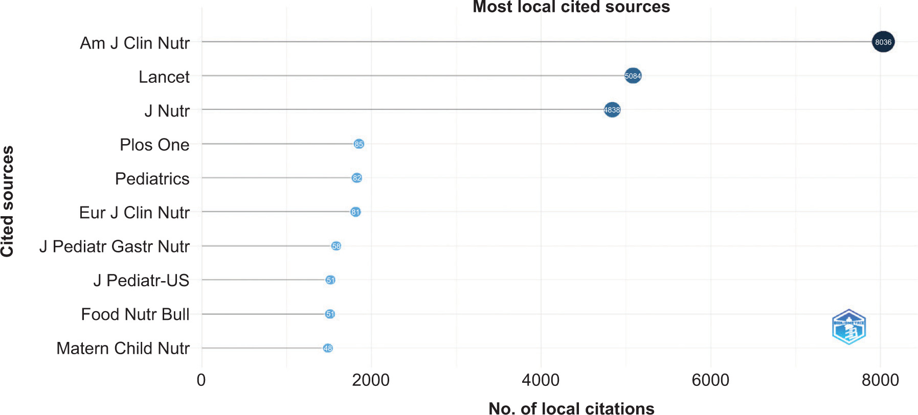 When Figure 7 was analyzed, it was determined that the most cited journals in the data set were the American Journal of Clinical Nutrition with 8,036 citations, The Lancet with 5,084 citations, and Journal of Nutrition with 4,838 citations. The other journals shown in Figure 7 follow these in terms of the number of citations they received on the subject.