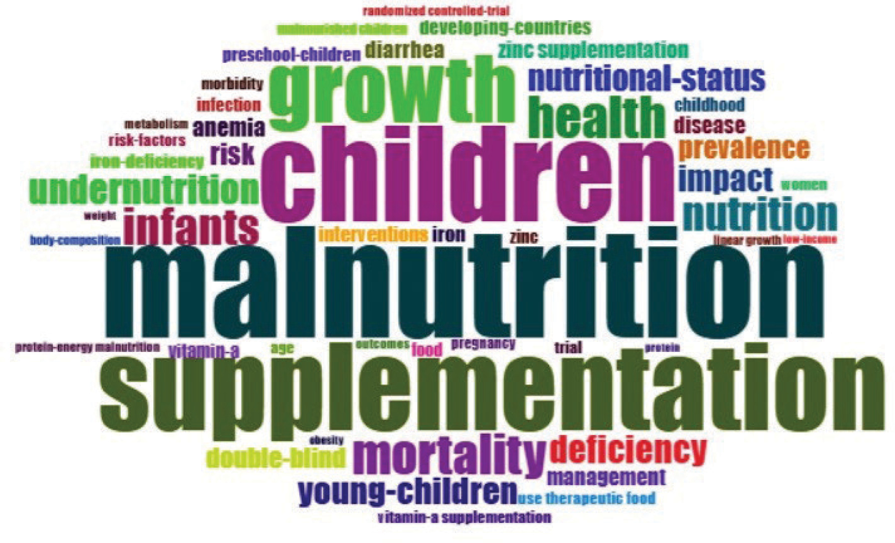 The larger size of words in the word cloud indicates that those words were used more frequently. As the word sizes decrease, it shows that the frequency of their use as keywords was lower. In this context, when Figure 8 was examined, it was demonstrated that the words malnutrition, supplementation, children, growth, nutrition, and mortality were the most frequently used keywords in the articles on the subject.