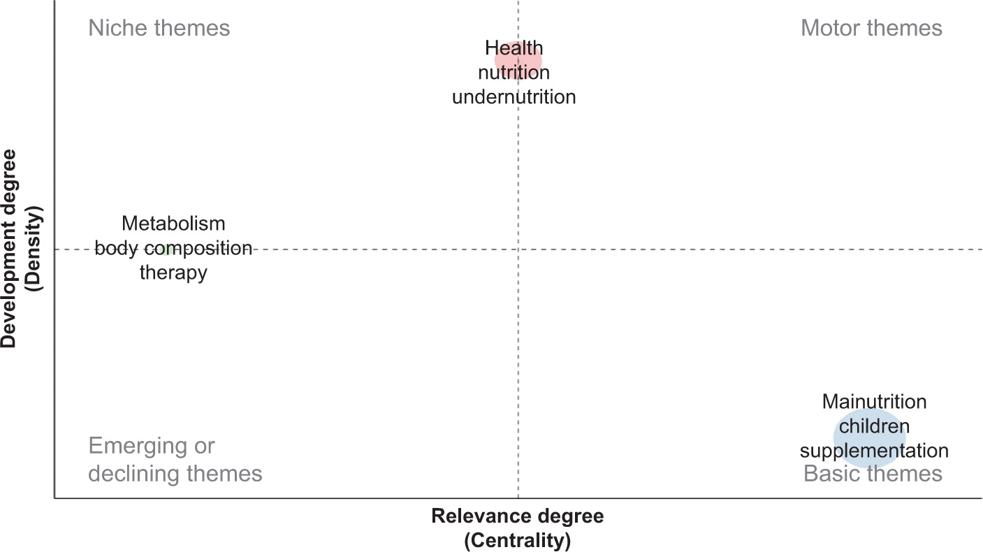 When the thematic graph in Figure 9 was examined, it was observed that there were four themes: Niche Themes, Motor Themes, Emerging or Declining Themes, and Basic Themes. The graph shows the thematic distribution based on the co-occurrence of keywords used by authors in the articles. According to Figure 9, health, nutrition, and undernutrition were popular keywords used together. Malnutrition, supplementation, and children were identified as basic keywords currently in use. Metabolism, body composition, and therapy were relatively less popular than the other keywords.