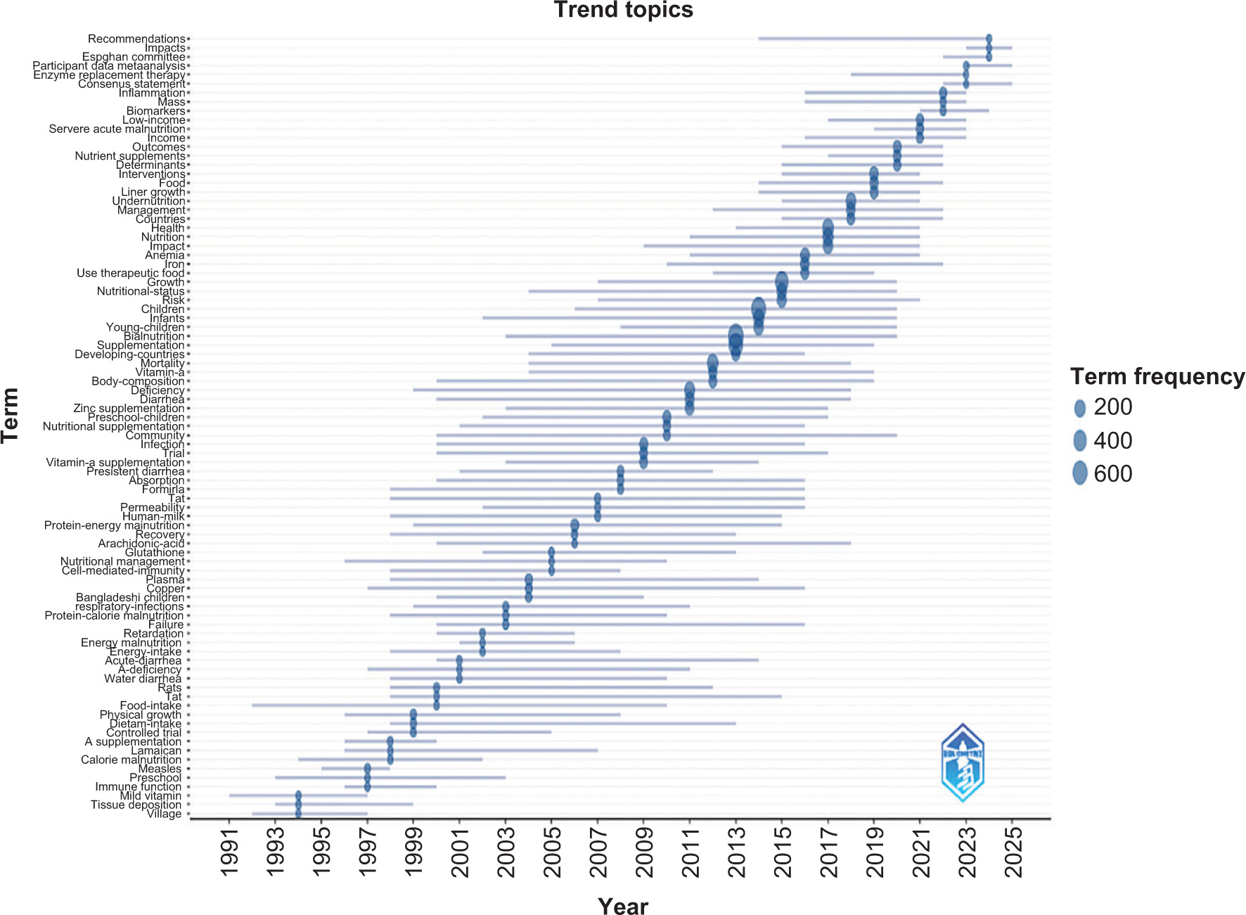In Figure 10, the years in which the trending topics in the articles were used most frequently are indicated by the size of the circles. In this context, when the figure was analyzed, it was determined that the keywords of this study—malnutrition, supplementation, and children—were used most frequently in 2013 and 2014, respectively. As the timeline approaches the present, it was observed that words such as health and inflammation, which are more related to health, were used more frequently.