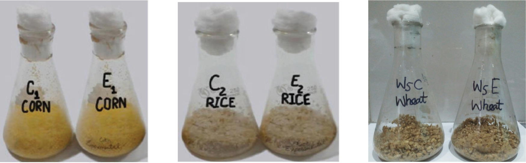 The optical density (OD) of selected lactobacillus, cultivated overnight on MRS agar, was measured against a blank to ascertain a concentration of 1×108 cells/mL of probiotics. Each contaminated sample, weighing 50 g and in crunched form, underwent treatment with lactobacillus suspension at a concentration of 1 × 108 cells/mL in a 500-mL flask. The infected samples received 17 mL of lactobacillus suspension, while the control group was treated with MRS broth without bacterial suspension. The experiment involved applying bacterial suspensions to samples. Following immunization, the flasks containing selected cultures were incubated at 32°C for 7 days. The injection of aflatoxins in selected crops is illustrated in Figure 2.
