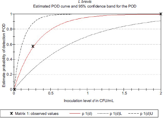 The POD curve harmonizes the statistical concepts and parameters between quantitative and qualitative method validation. POD characterizes the method’s response concerning concentration as a continuous variable. The POD model is a useful and immediate tool for the graphical representation of response curves for qualitative methods. Figures 13 show the estimated POD curves and 95% confidence bands for L. brevis, F. lindneri, and P. damnosus. The observed POD curve for L. brevis (Figure 1) graphically confirms this trend, showing a steep increase in detection probability as the inoculation level develops from 0.01 to 0.5 CFU/mL, before plateauing at higher concentrations.
